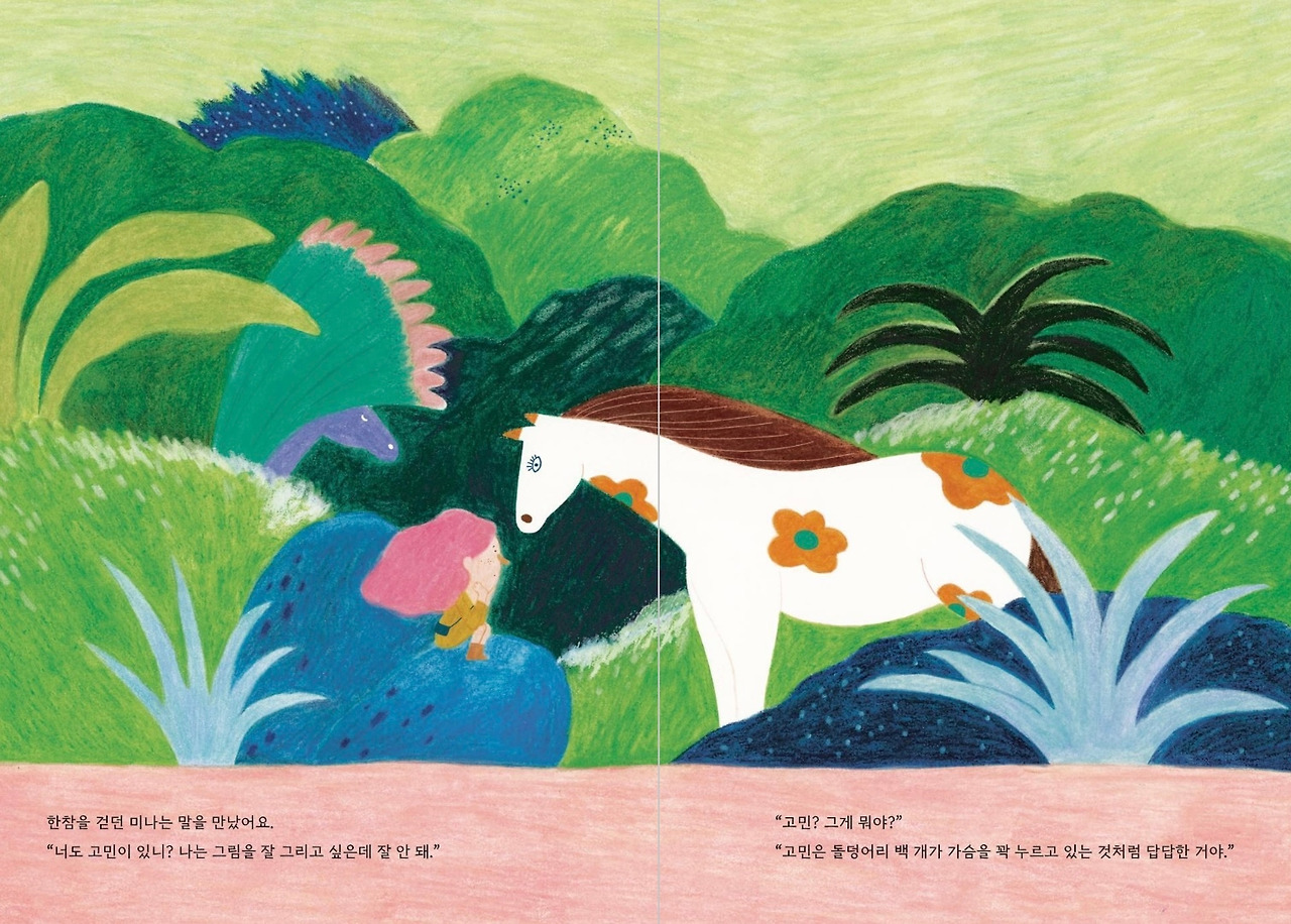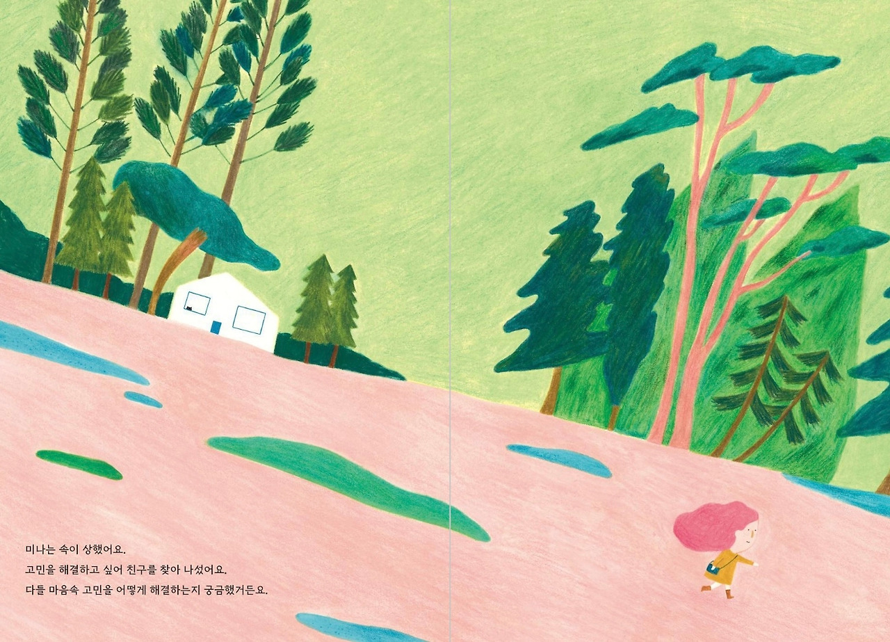 그림이 뜻대로 그려지지 않아 고민인 미나는 고민을 해결할 방법을 찾아다닌다. 고민을 해결하기 위해 어떻게 해야 하는지 동물들과 대화하는 과정을 보며 아이들도 자신만의 고민해결 방법을 찾아볼 수 있을까?