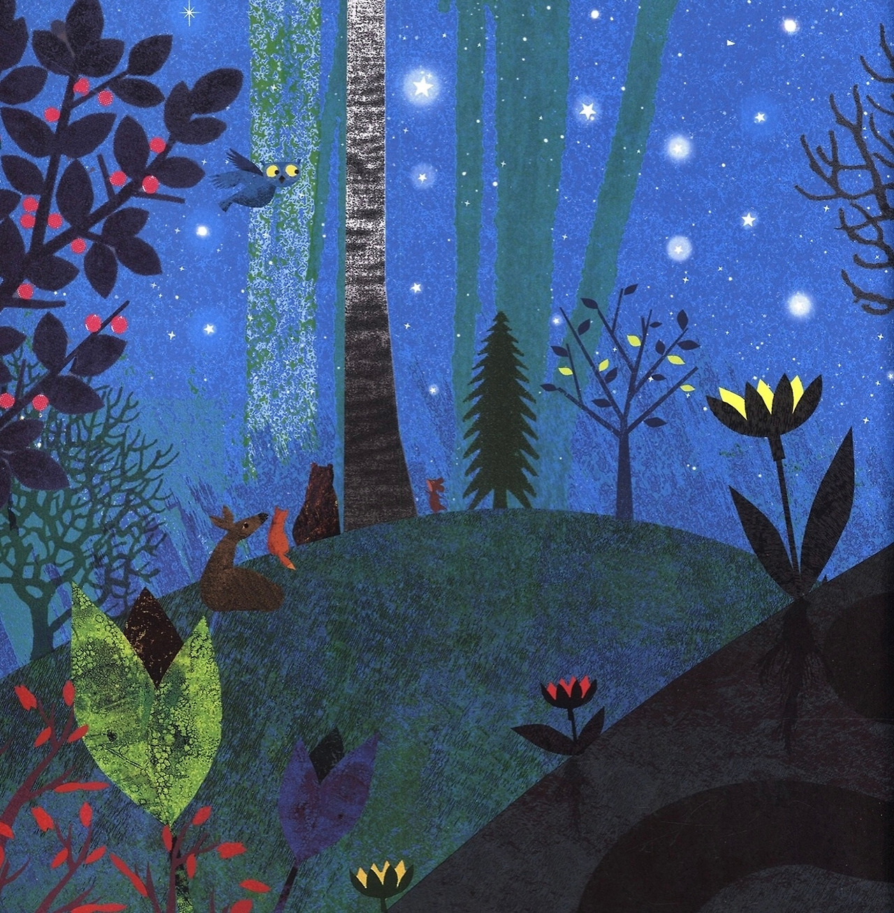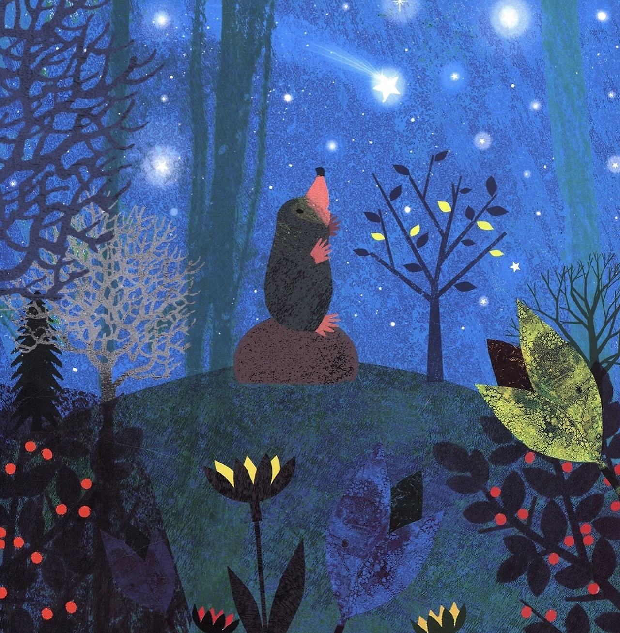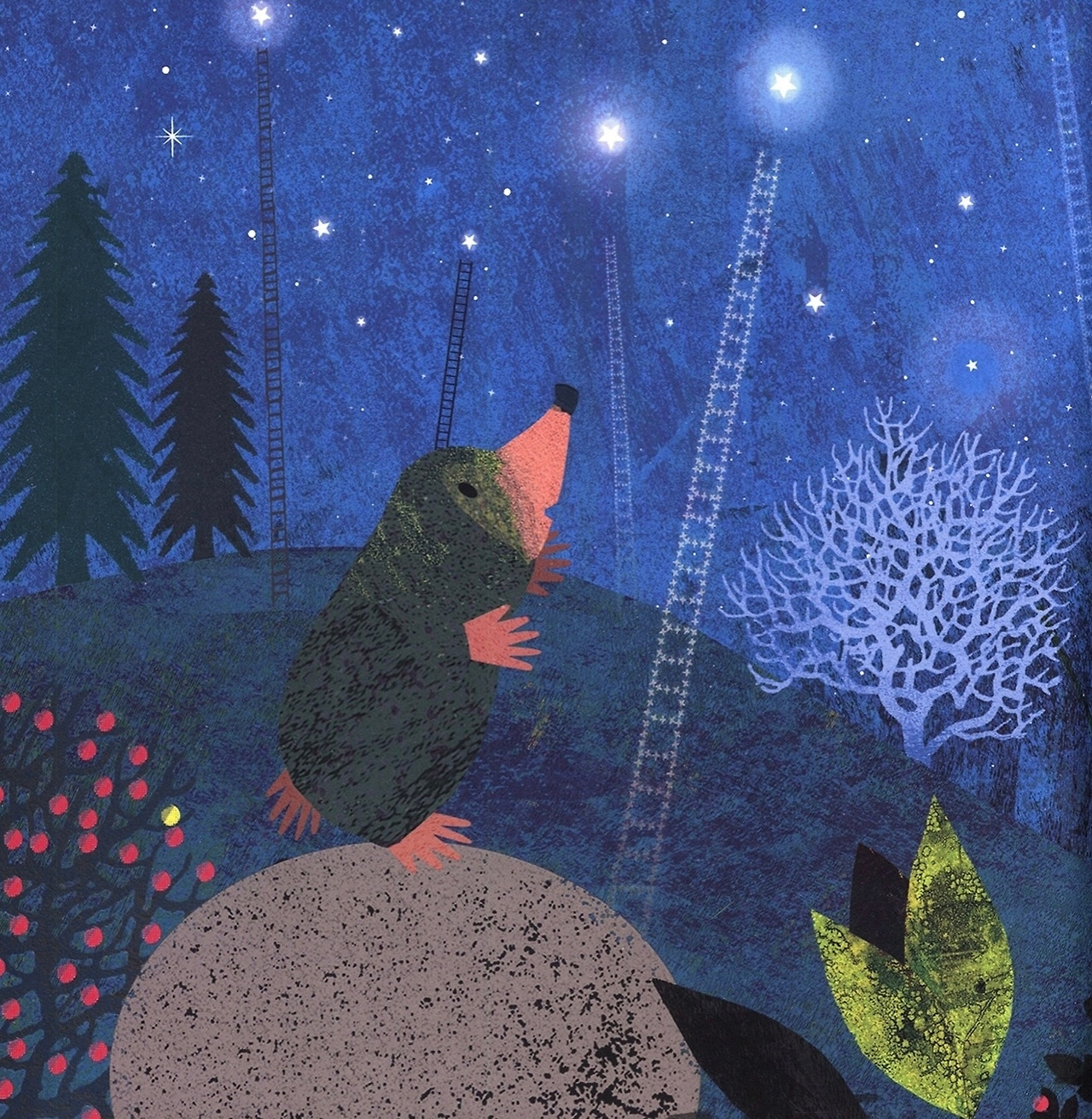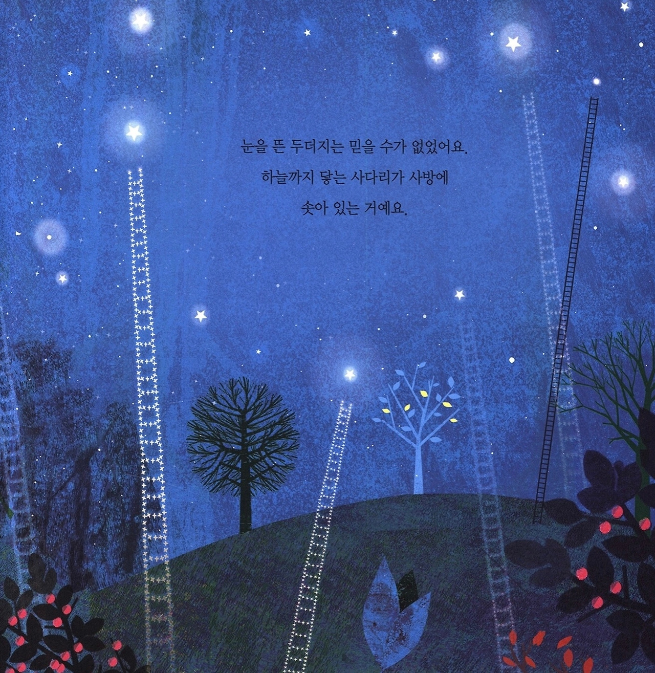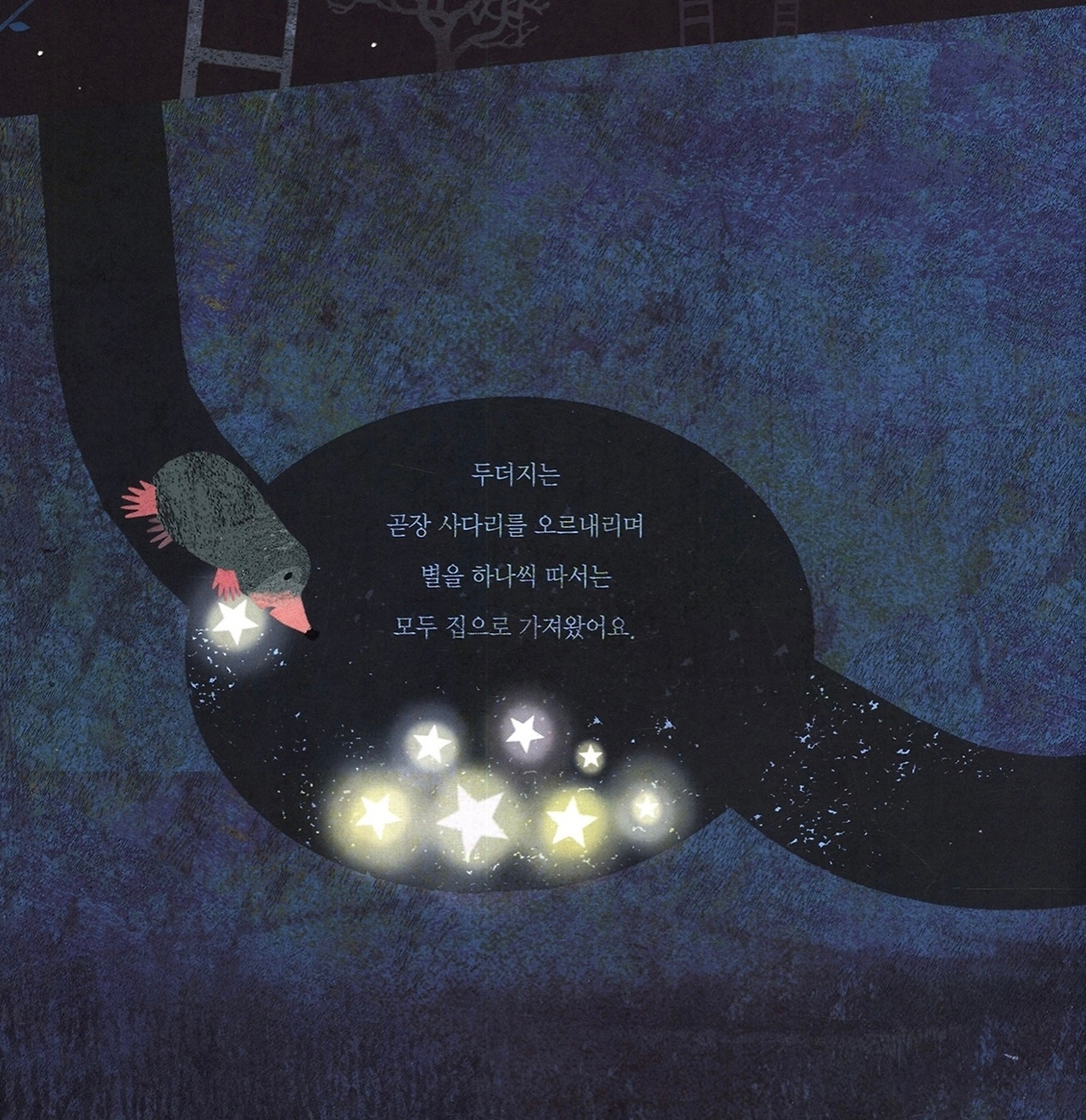 눈을 뜬 두더지는 믿을 수가 없었어요. 하늘까지 닿는 사다리가 사방에 솟아 있는 거예요. 두더지는 곧장 사다리를 오르내리며 별을 하나씩 따서는 모두 집으로 가져왔어요.