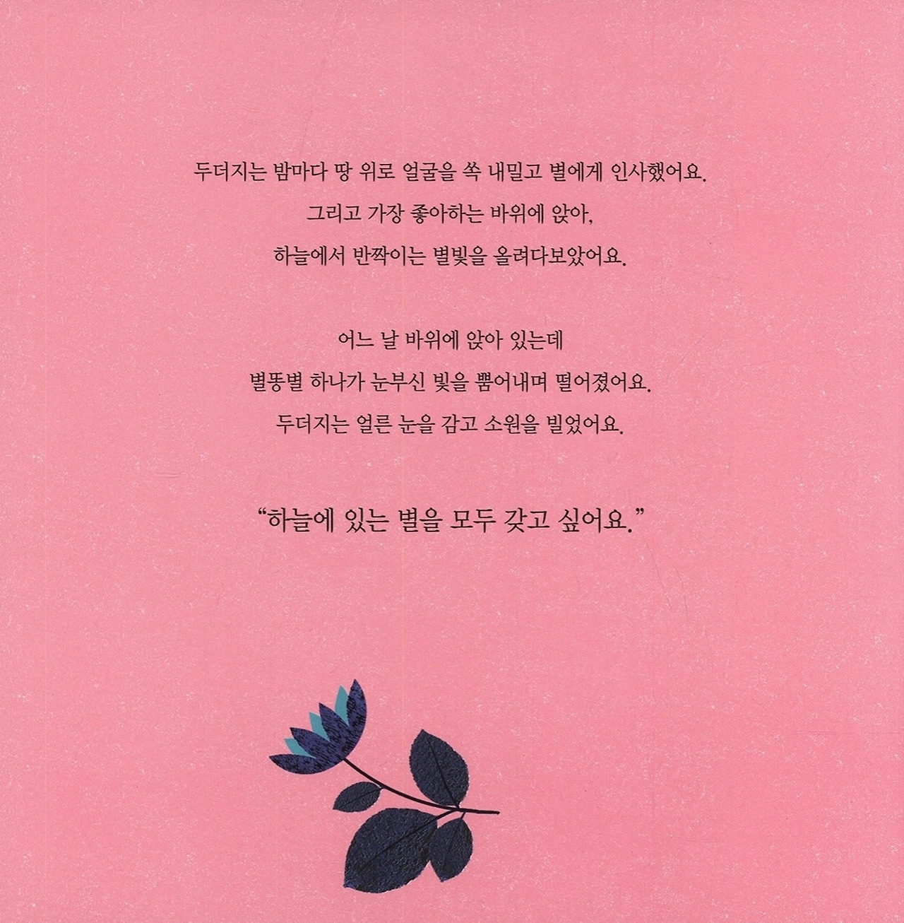 두더지는 밤마다 땅 위로 얼굴을 쏙 내밀고 별에게 인사를 했어요. 그리고 가장 좋아하는 바위에 앉아, 하늘에서 반짝이는 별빛을 올려다보았어요.