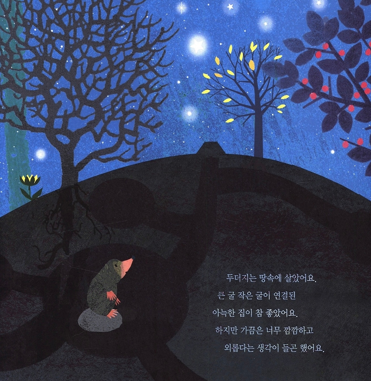 두더지는 땅 속에 살았어요. 큰 굴 작은 굴이 연결된 아늑한 집이 참 좋았어요. 하지만 가끔은 너무 깜깜하고 외롭다는 생각이 들곤 했어요.