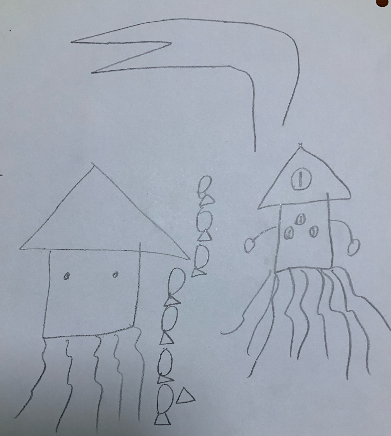 “엄마, 얘네는 선원들이 바다에서 만난 괴물들이야. 얘는 이름이 키라켄이야... 얘는 팔을 이렇게 펄럭 펄럭 움직이면서 이동하는데... 얘는 새끼를 어떻게 낳냐면....”