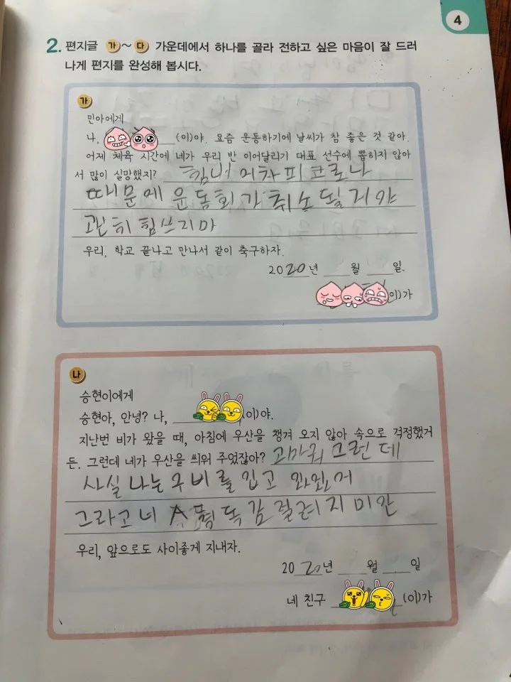 “괜찮아. 마음을 담아 쓰는 거잖아. 너의 진짜 마음이라면 웃긴 거라도 괜찮으니까 솔직하게 써. 그리고 아마 선생님도 하나하나 다 검사하실 수 없을 거야. 그렇게 많은 친구들의 교과서를 어떻게 다 살펴보시겠어? 그냥 스트레스받지 말고 즐기면서 해.”