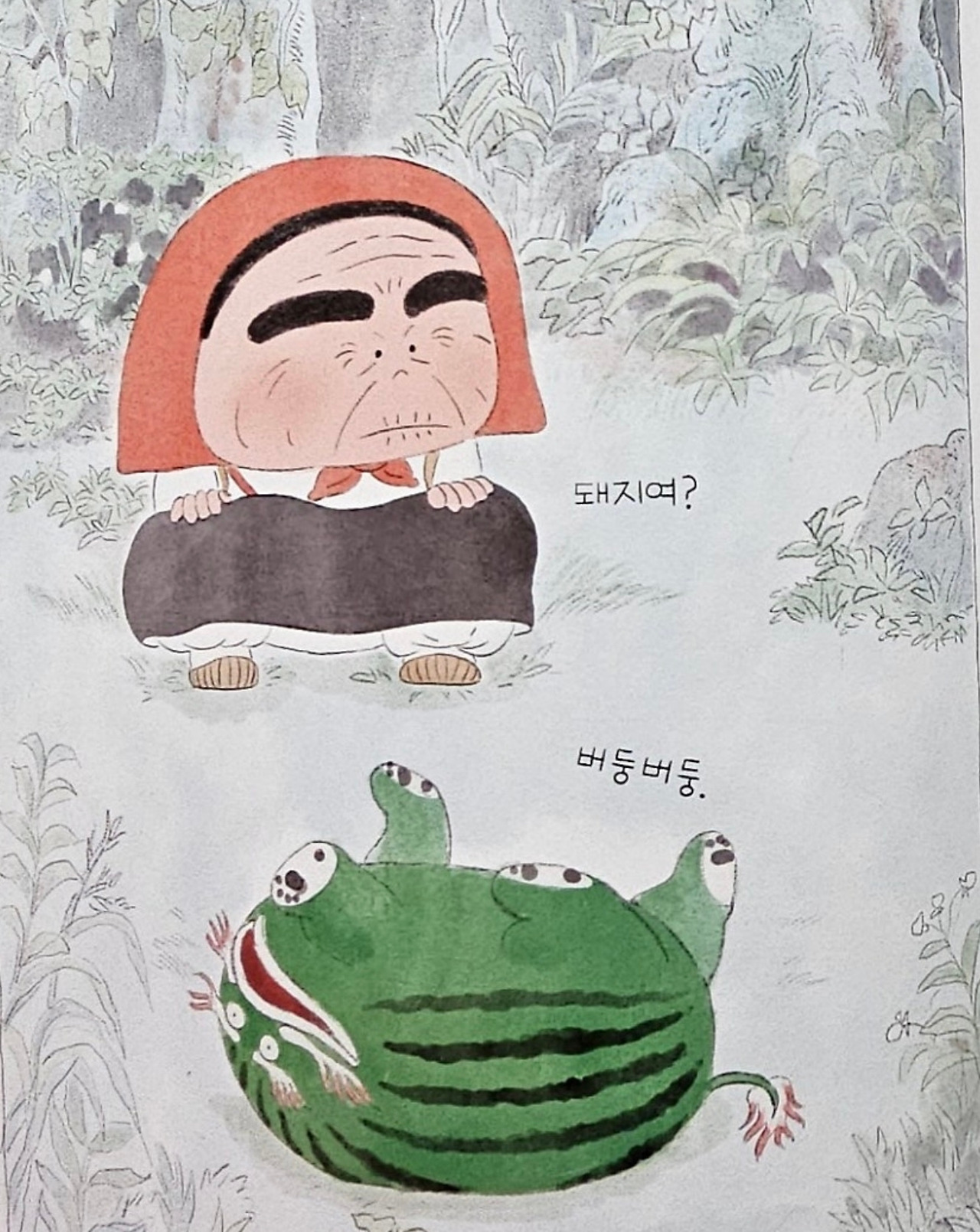 태양 왕수박이 아니다. 태양왕 수바. 태양을 지키는 용이다. 귀가 어두운 할머니가 사투리를 쓰며 사건을 해결하는 상황들이 참 재미있다. 몸이 뒤집혀 버둥거리는 태양왕 수바를 보며 돼지냐고 하는 장면에서부터 나도 모르게 실실 웃음이 나오다가 장면장면마다 빵빵 터지며 재밌게 봤던 그림책이다. 아파서 우울한 아이에게 수박 한 통 사줄 수 없는 가난한 어미는 아이에게 태양왕 수바 이야기나 들려줘야겠다. 태양을 비추어 생명을 지킨다는 태양왕 수바가 우리 아이의 열도 가지고 가주길 바라면서.