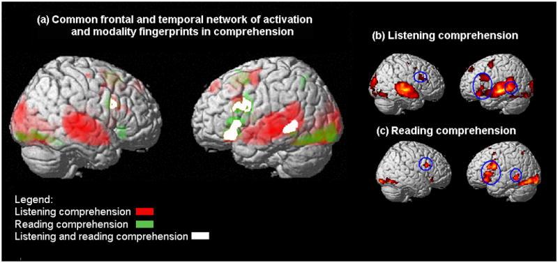 The contrast between listening and reading comprehension showed more activation for listening comprehension in bilateral superior temporal gyri. There was also more activation for listening comprehension in bilateral middle temporal gyri, right angular gyrus, and right insula. Listening comprehension was also associated with more overall activation of the whole brain when compared to reading comprehension