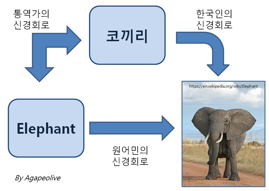 우리나라에서 세계화를 외친 지 10여 년이 지났다. 정착하는 외국인이 점점 늘어나 이제는 우리나라에도 그들이 무리 지어 거주하는 특정 동네들이 생겨나기 시작했다. (이태원 서래마을 독일마을 등 그 외 우리나라 이민 온 사람들의 외국인 마을들) 그리고 강남 스타일 및 기타 한류의 수출로 많은 외국인들이 우리나라를 방문하게 되었다. 필자가 있는 부산도 예외는 아니다. 한국인과 결혼하여 정착을 하거나, 혹은 우리나라로 이민을 와서 외식사업 및 기타 사업을 펼치는 것을 본다. 그러다 보니 길거리에서나 혹은 식당에서 외국인들을 자주 마주치게 된다. 그리고 그들이 식당에서 음식을 주문하거나 할 때 영어가 안 되는 한국식당의 주인이나 종업원들을 보기도 하고 혹은 길거리에서 길을 몰라 지도를 보고 자신들이 어디로 갈지 주변 사람들에게 물어볼 때 영어가 안되어 난처해하는 한국인들도 종종 본다. 필자는 그럴 때마다 자원하여 통역을 해준다. 그런데 통역이 예상과 달리 쉽지 않다. 영어를 한국어로 또는 한국어를 영어로 돌아가며 말을 하고 해석해 주는데 순간순간 특정 단어가 생각이 나질 않아 한참을 "어~" 하다가 그 단어를 설명하게 되기도 한다. 어떤 경우는 한국사람에게 영어로 설명하거나, 외국인에게 한국말로 설명하는 웃지 못할 경험도 한다. 여하간 통역을 하면서 필자 자신이 황당하고 당황하게 되는 것은 바로 한국말로 통역할 때 우리나라 말이 생각이 안나 버벅 거리는 것이다. 필자는 어학연수나 어려서 외국에서 살다가 오지 못했고, 당연히 모국어는 한국어이며, 30살이 넘어서 영어를 했기에 영어 단어가 생각이 잘 안나는 것은 이해가 될수 있다. 하지만, 한국어가 모국어인 필자에게 우리나라 단어나 표현이 생각나지 않는 것이다. 또 다른 예로 우리 아들과 동물원에 가서 코끼리를 보고 "Hey Look! It's an Elephant!"라고 설명했는데, 순간 우리나라 단어가 생각나지 않아 몇 초간 "어~~~ 어~~~ " 하게 된다.