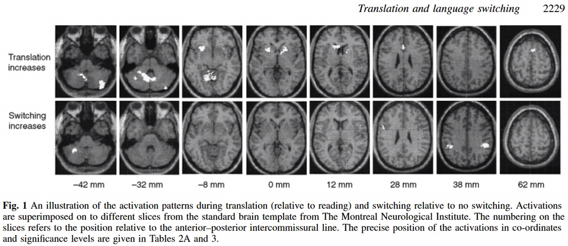 위의 사진은 통역하는 사람의 뇌를 기능적 자기공명 영상 (functional MRI)로 촬영한 것이다. 기능적 자기공명 영상이란 뇌영상을 찍을 때 피검자에게 어떤 일을 수행시키게 한 뒤 뇌의 대사량이 증가한 곳을 보게 되는 것으로 이를 통해 어떤 수행능력을 할 때 사용되는 뇌의 위치를 파악하는 검사방법이다. 이를 통해 통역할 때 사용되는 뇌의 위치와 언어를 바꿀 때 사용하는 뇌의 위치를 확인할 수가 있다.
