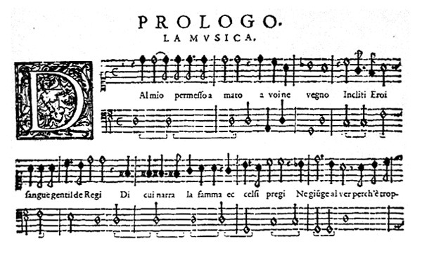 바로, 곤차가 가문 소속의 궁정 음악가 클라우디오 몬테베르디(Claudio Monteverdi)가 그의 군주와 귀족들 앞에서 선보인 <오르페오>(Ofreo)입니다. 악보의 첫 페이지에는 ‘파볼라 인 무지카(Fabola in musica)’, 즉 ‘음악으로 듣는 이야기’라고 적혀 있었습니다. 이미 9년 전인 1598년 최초의 오페라로 볼 수 있는 페리의 <다프네>가 만들어지기는 했지만, 아직은 '오페라'라는 말이 널리 쓰이지 않았고, 이렇다 할 작품도 거의 없던 때였던 건데요.