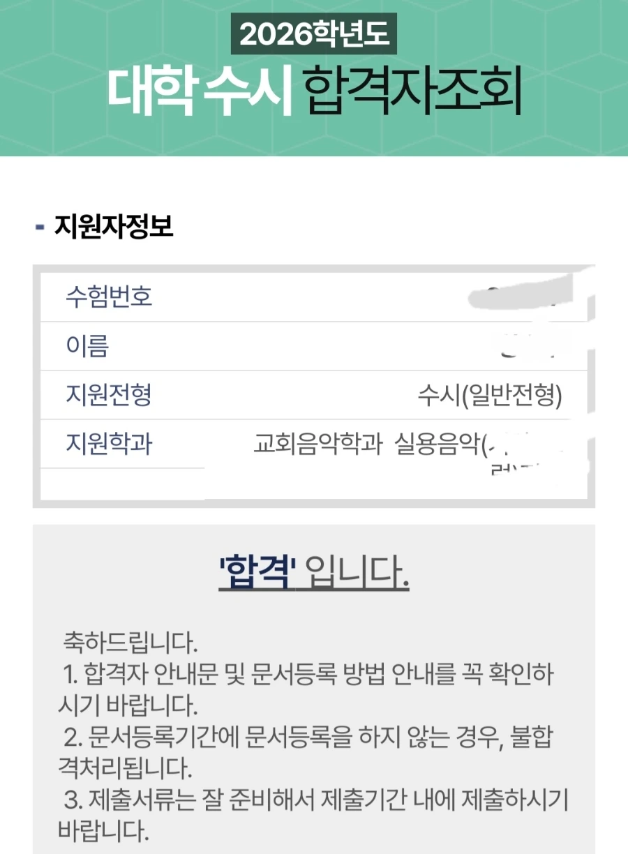아들이 ㅈㄹ신학대학교 교회음악학과 수시 추가모집에 합격했다.