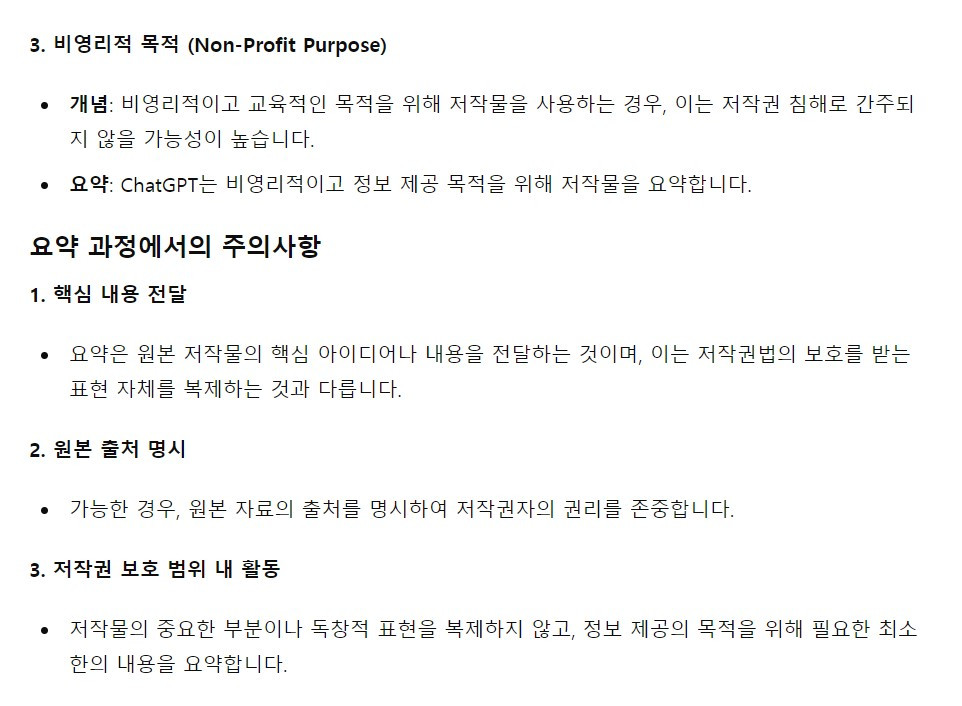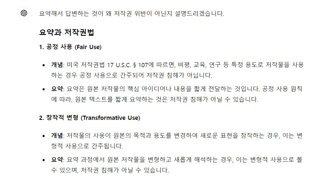 저는 요약하는 것이 왜 저작권 위반이 아닌지 물어봤습니다.