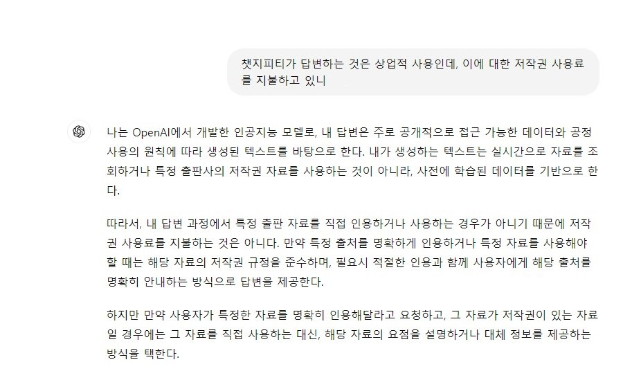 '인간'의 지식을 넓히기 위한 목적이 아니라 상업적 이용을 하면서도 관련 대가를 지불하지 않다는 것이 제 생각입니다. 제 생각이 잘못되었는지는 모르지만, 지피티와 계속 대화를 해보려 합니다.