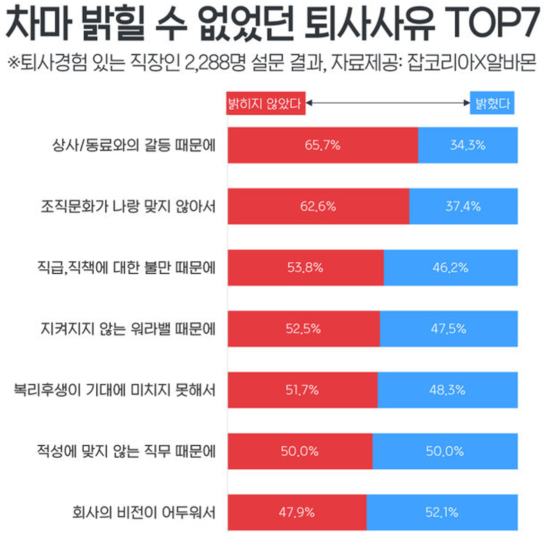 우리가 회사를 그만두는 표면적인 이유는 급여, 직무 적성 등을 이유로 들지만, 말하지 못하는 퇴사 사유는 조금 다른 결과를 보여 주고 있습니다. 특히 첫 번째와 두 번째 사유는 인간관계에서 오는 문제점이라는 것을 관심 있게 볼 필요가 있을 듯합니다.