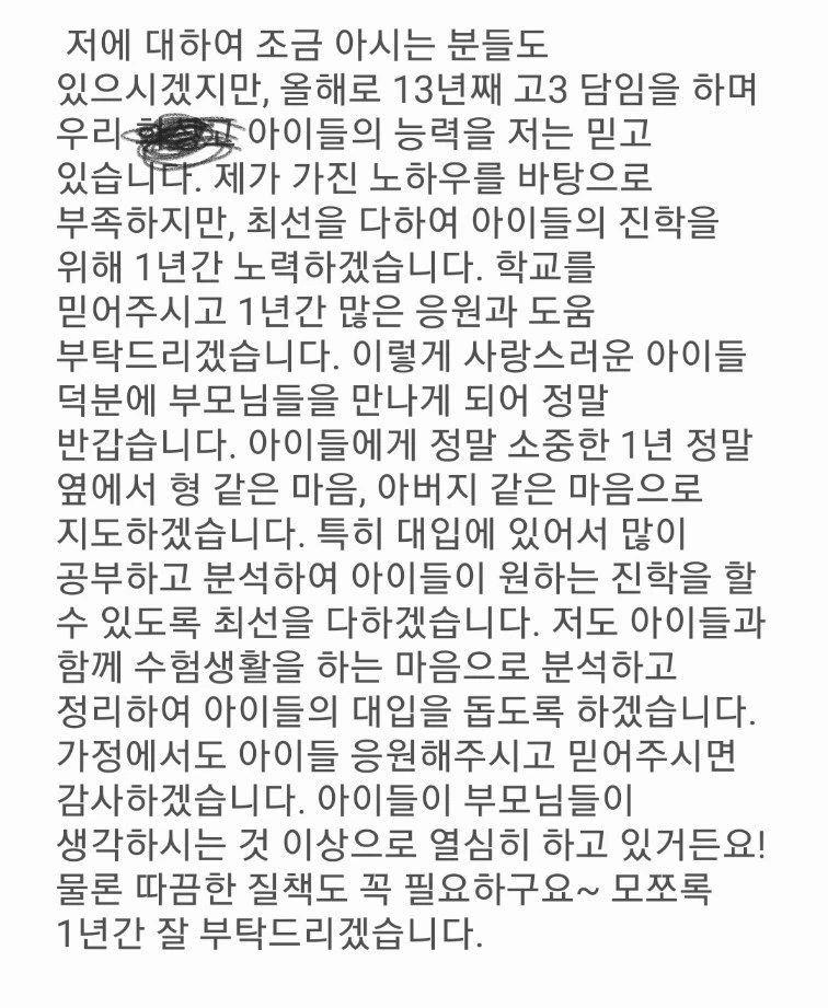 “아니요, 선생님은 우리 반 아이들 34명이 모두 원하는 대학, 원하는 학과에 보내는 것이 목표래요. 차례대로 아이들과 얼마나 상담을 많이 하시는 데요. 그리고 시간이 날 때마다 각 대학의 입시 정보도 엄청 공부를 하세요.”