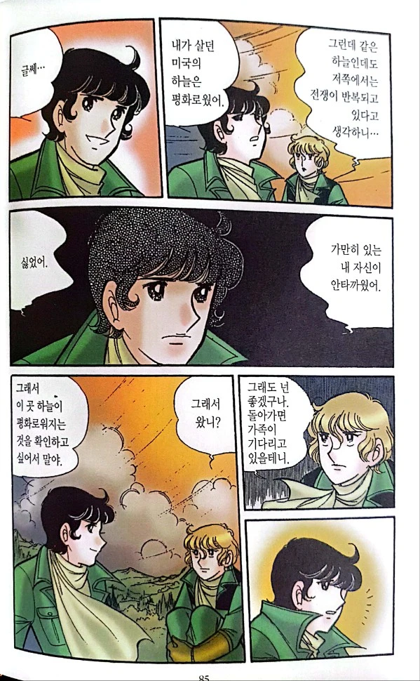 “내가 살던 미국의 하늘은 평화로웠어. 그런데 같은 하늘인데도 저쪽에서는 전쟁이 반복되고 있다고 생각하니 싫었어. 가만히 있는 내 자신이 안타까웠어.”(p.85, 6권)