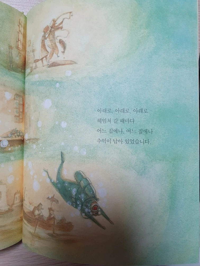 어느 날 할아버지는 또다시 바닷물이 마루까지 차오르자 또 새집을 지을 생각을 한다. 그러다 집을 짓던 톱과 망치가 바닷속 아래로 빠지고 만다. 그는 그 연장들을 찾아 바닷속으로 깊이 잠수한다. 그렇게 점점 집 아래로 내려가며 할아버지는 기억 저 너머로 감춰뒀던 소중한 추억들과 만난다. 3년 전 할머니와 함께 살던 시절의 집, 즐거운 마을 축제가 있었던 집, 맏딸을 시집보냈던 집, 키우던 새끼 고양이를 잃어버렸던 집, 할아버지와 할머니에게 처음으로 아기가 태어났던 집……. 주변 마을 사람들이 떠나도 못 떠나고 지켜야만 했던 기억들이다. 할아버지가 아래로 헤엄치며 만났던 집들 모든 곳에 지나간 추억들이 남아 있었다.