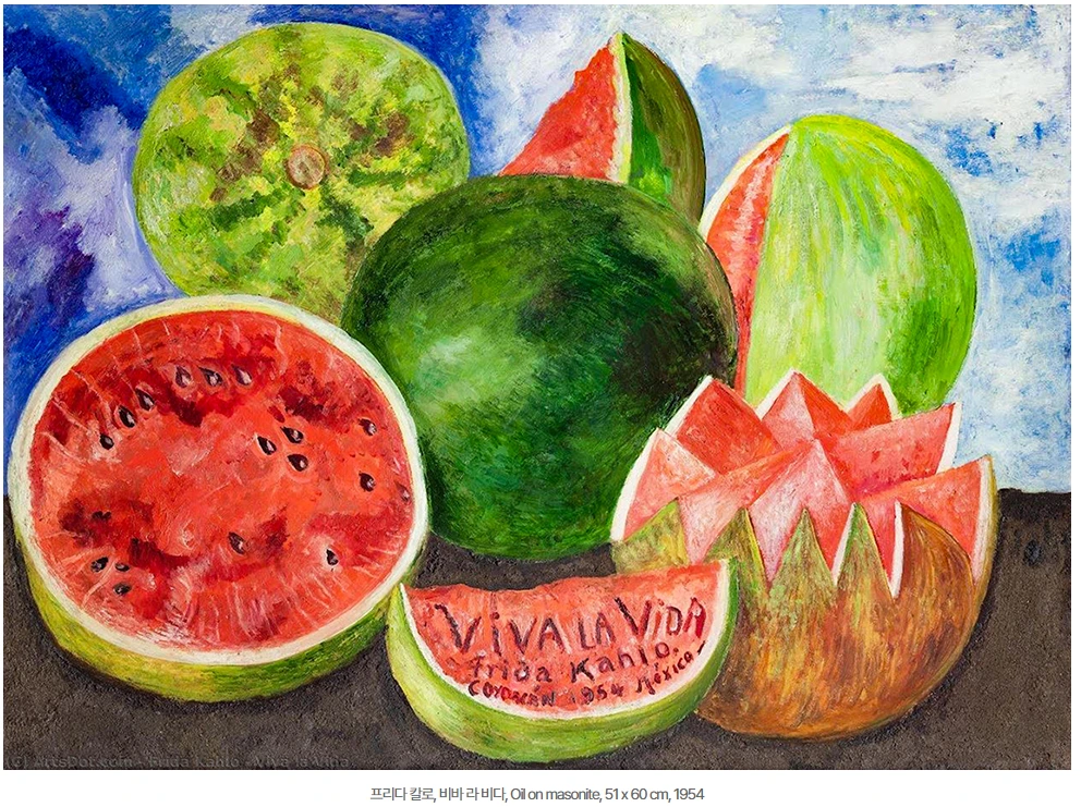 도슨트가 설명하는 멕시코 화가 프리다 칼로의 삶 역시 특별했다. 평범한 사람의 관점에서 바라보는 그녀의 삶은 인생 자체가 고통의 연속으로 보일 만큼 비참했다. 프리다는 18세 때 전차 사고로 척추가 망가지는 상처를 입었고, 이후 자유로운 영혼의 디에고 리베라를 만나 사랑을 했지만, 동시에 피눈물을 흘리는 정신적인 아픔을 겪었다. 하지만 그녀는 본인의 인생을 미워하지 않았다. 프리다는 말년에 척추 통증이 도져 침대 생활을 하면서도 그림을 그렸다. 그녀의 마지막 그림이 바로 수박 정물화인 ‘VIVA LA VIDA’이다. 해석하면 ‘인생이여 만세’인 셈이다. 단단한 껍질을 지녔지만, 연약한 과육을 지닌 수박, 그리고 스페인어로 쓰인 ‘VIVA LA VIDA’, 프리다 칼로의 마지막 유작은 유명 영국 록밴드 콜드플레이(Coldplay)에 큰 영감을 주어 명곡의 이름 속에서 영원히 반짝이고 있다.