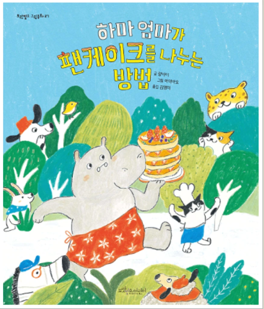 알록달록한 색감이 돋보이는 홍콩작가 량야이의 <하마 엄마가 팬케이크를 나누는 법>(보랏빛소어린이, 2022)은 “하마 엄마가 따끈따끈한 팬케이크를 구웠어요. (..) 숲속 동물들과 두루두루 나누어 먹을 거예요.”라는 첫 장으로 시작된다. 출판사는 이 책을 '나눔과 공정함을 배우는 예쁜 그림책'이라고 소개하고 있다. "모두가 행복해지려면 어떻게 팬케이크를 나누어야 할까요?"라는 질문에서 시작된 하마 엄마의 고민은 다양한 동물들의 등장과 함께 예상치 못한 상황으로 흘러간다.