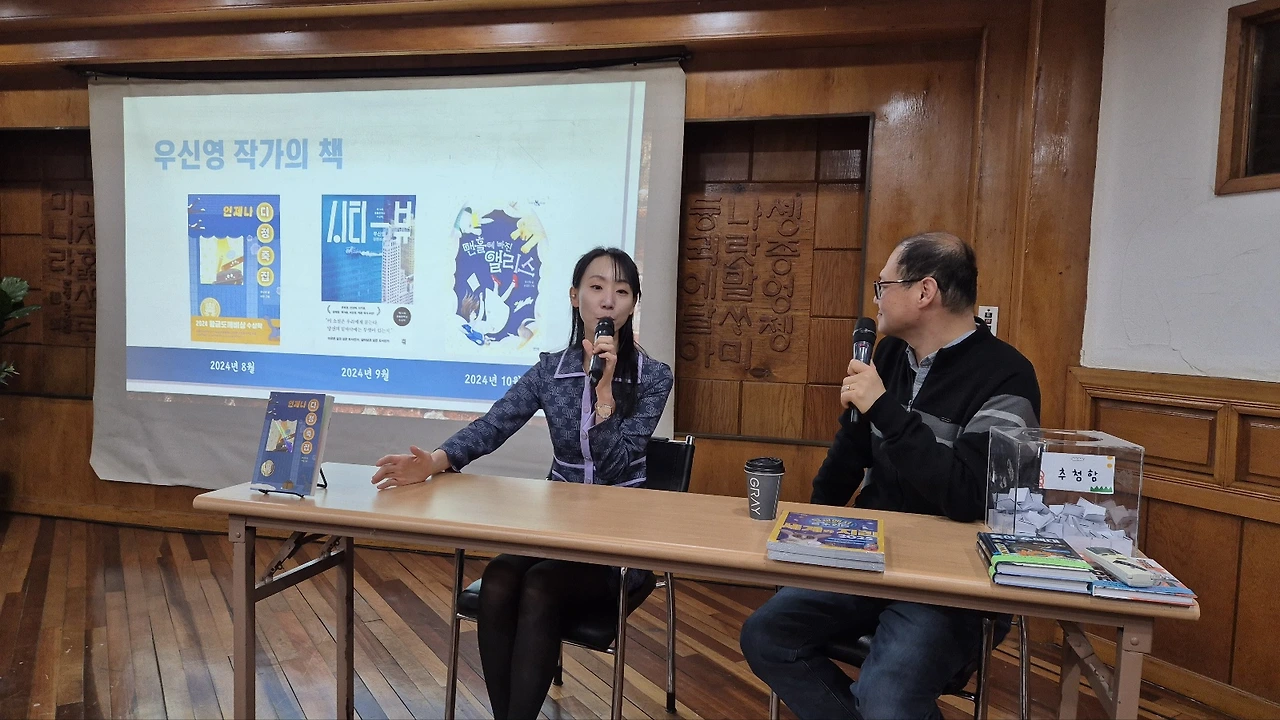 연수의 마지막은 <언제나 다정 죽집>으로 제30회 황금 도깨비 상을 수상한 우신영 작가가 맡았다. 세련된 원피스 의상에 가냘픈 체형을 지닌 작가는 작품에 몰두할 때는 잘 먹지 않는다고 했다. 그래서 주로 먹는 내용에 관심이 많다는 그녀는 이번에 수상한 이 한 편의 동화 속에 따뜻한 팥죽과 달콤한 고양이 빵이 만들어 내는 마법을 보여주었다. 작가는 본인의 인생 역시 ‘나를 이룬 다정한 맛을 찾아서’라는 주제로 표현했다. 베지밀 B를 항상 들고 다니며 어린이 브리태니커 사전만 들춰봤던 아기의 ‘분유 맛’, 이런저런 책을 가리지 않고 읽던 어린 소녀의 ‘금단의 맛’, 수업 시간에 박경리의 <토지>를 읽다 경험한 사춘기 소녀의 ‘매맛’, 연애에 몰두하던 청춘의 ‘쓴맛’과 교직 생활의 설움이 담긴 ‘눈물 맛’과 ‘짠맛’, 그리고 한 아이의 부모가 되면서 느꼈던 ‘마라 맛’, 마지막으로 교수직을 그만두고 작가로 거듭난 ‘다시 태어난 맛’이다. 작가는 특히 2025년이 전업 작가로 되기로 결심하며 글쓰기에 전념한 1살이 되기로 결심한 해라고 밝혔다. 그녀를 아예 신예 작가로 취급하기에는 작가의 경력과 작품 이력들이 너무 화려하다. 그만큼 앞으로의 발자취를 기대되는 작가이기도 하다.