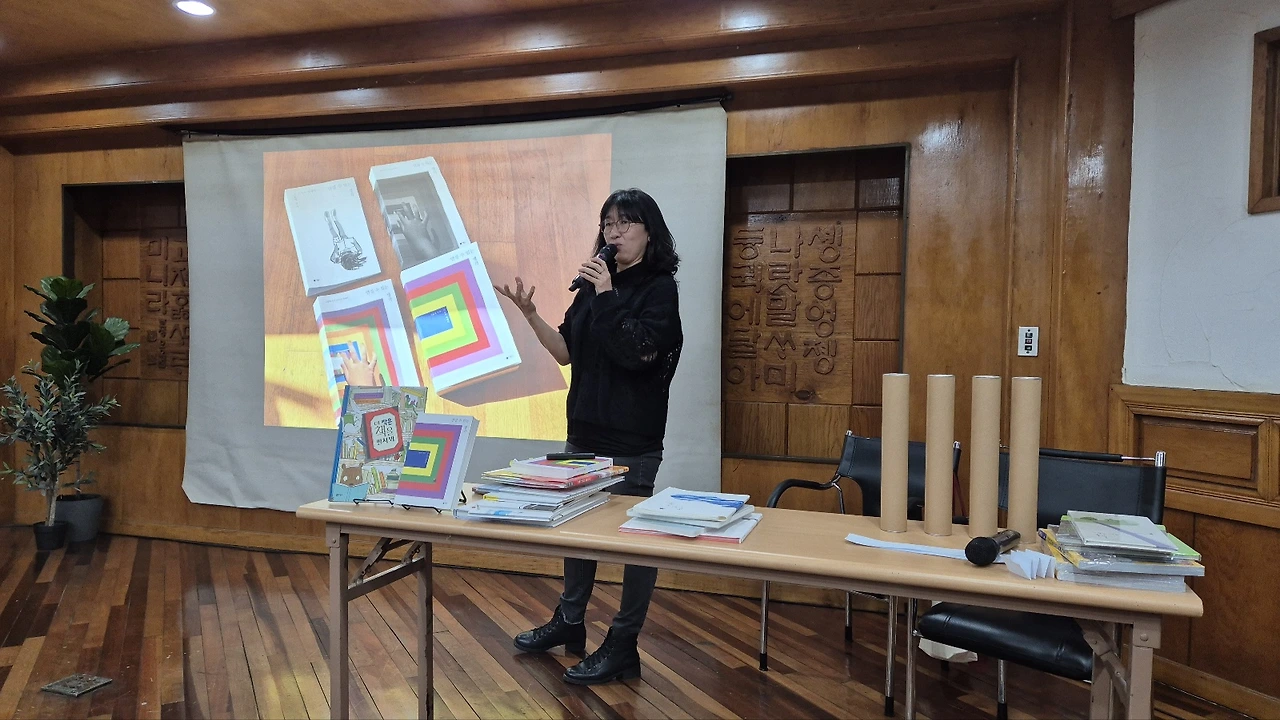 연수 둘째 날의 첫 시작은 베스트셀러 작가 이수지가 밝히는 에세이, <만질 수 있는 생각>에 관한 후일담이다. 작가는 그림책 작가로서의 불확실한 세계로 들어가기까지, 아이들의 육아에 맞춰 엄마와 작가의 역할을 재빠르게 바꾸며 작업하던 시절, 그리고 그림책에 대한 애정 하나로 버티며 그림책 작가로 성공하기까지 느꼈던 숱한 생각들을 만질 수 있는 한 권의 책으로 완성시켰다. 그녀는 엄마로서 작가로서 살아온 시간들이 쉽지 않았지만, 블로그 활동을 하며 그 시절의 감정들을 기록하고 해소했다고 한다. 그런 결과물이 쌓여 현재의 에세이로 탄생한 셈이다. 작가는 그 시절 사람들에게 가장 공감과 댓글을 많이 받았던 이야기가 바로 세상살이에 대한 힘듦과 푸념에 관한 내용이라고 말했다. 그녀는 사람들이 본인의 삶과 별반 다르지 않은, ‘너 역시도 똑같구나’라는 동질감에서 큰 위로를 받는 듯하다는 생각을 덧붙였다. 반짝이는 상상력을 중심으로 글 없는 그림책을 주로 쓰는 작가는 작품 속 빈 여백에서 독자들이 본인의 이야기를 넣을 수 있기를 바란다고 말했다. 한 마디로 이수지 작가는 ‘경계 마법사’라고 정리할 수 있다. 그녀에게는 그림을 매개로 꿈과 현실의 경계를 넘게 만드는 세상을 창조하고 독자들은 그 속에서 자신의 이야기를 만들 수 있다.