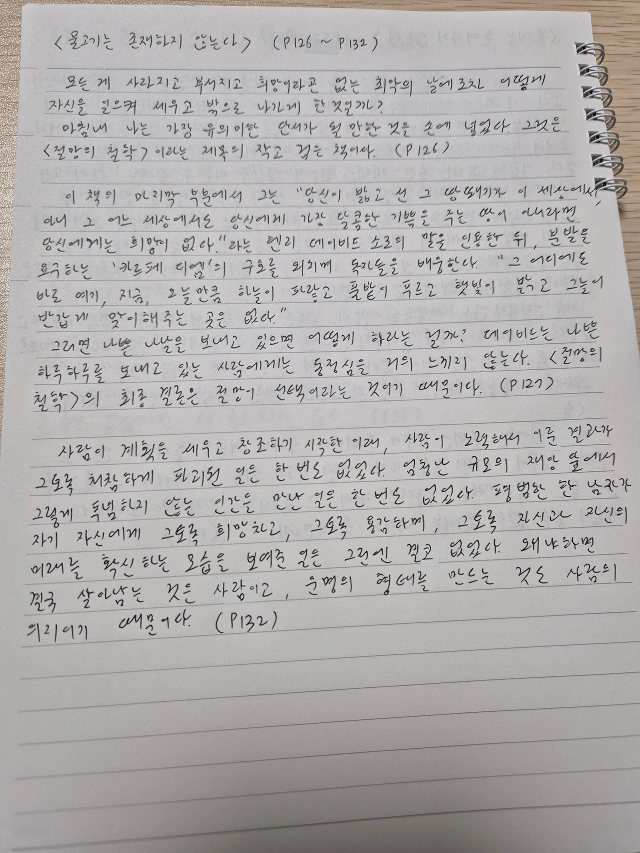 저자는 이런 태도가 막연한 긍정주의와는 다르다고 주장한다. 옛날 현자들이 앵무새처럼 뱉어대는 ‘카르페 디엠’과 같은 ‘현실을 살아라’라는 구호는 눈앞에 닿친 절망을 완전히 극복하기에는 미흡해 보인다. 한 치 앞도 보이지 않는 암흑 같은 불행 속에서 ‘물이 반밖에 안 남았네 vs 물이 반이나 남았네’와 같은 교과서적인 고민은 할 수가 없다. 귀동냥으로 주워들은 긍정적인 면을 내뱉기에는 눈앞의 절망이 거대하다.