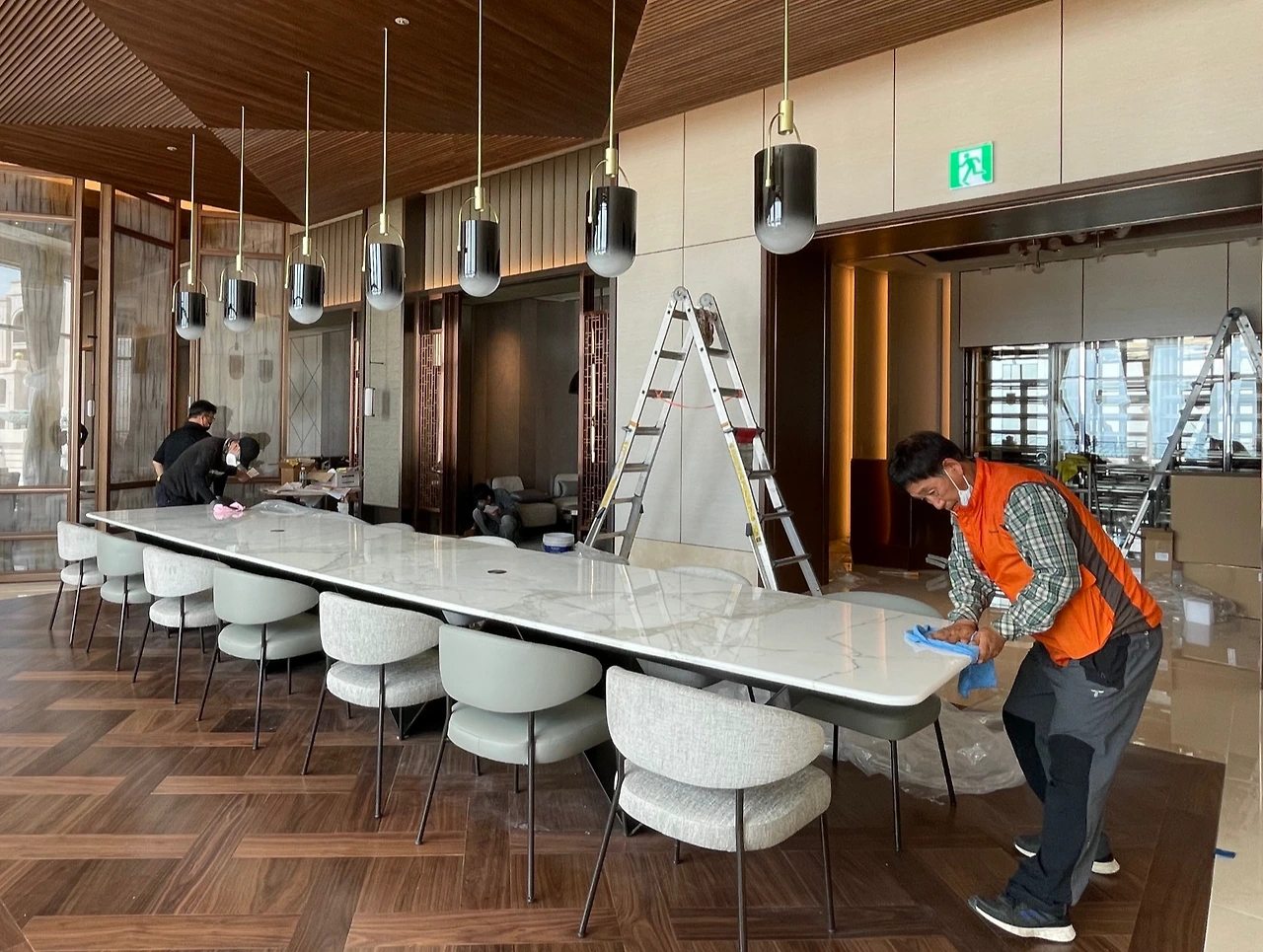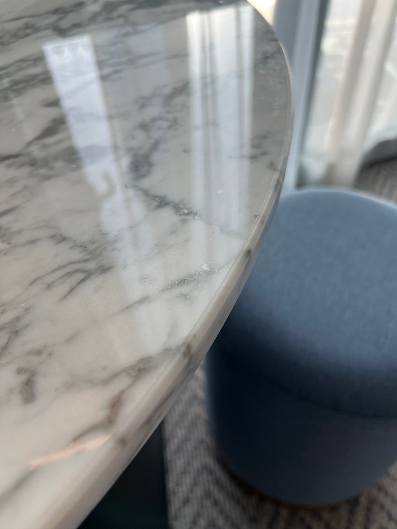 특히나 커뮤널 테이블 같이 공간에서 주요 포인트가 되는 경우, 천연 대리석의 적용 유무에 따라 효과가 극대화되거나 위축될 수도 있다. 작은 사이즈의 다이닝 테이블이나 서비스 스테이션의 상판은 인조석으로 대체하고 메인 커뮤널테이블은 천연대리석을 유지하는 등의 VE(Value Engineering)으로 현실적인 타협점을 찾아가는 과정 또한 프로젝트 진행의 일환이 된다. 담당자로서 공간을 운영하시는 분들의 고충을 이해하고 관리가 용이한 점을 찾는 유연함과 디자인적으로 중요한 부분에는 고집을 부릴 줄 아는 우직함으로 최선의 결과를 끌어내어야 한다.