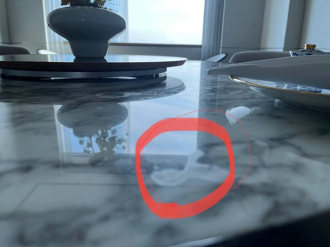고급 호텔 테이블 상판이 지저분하다는 내용입니다.