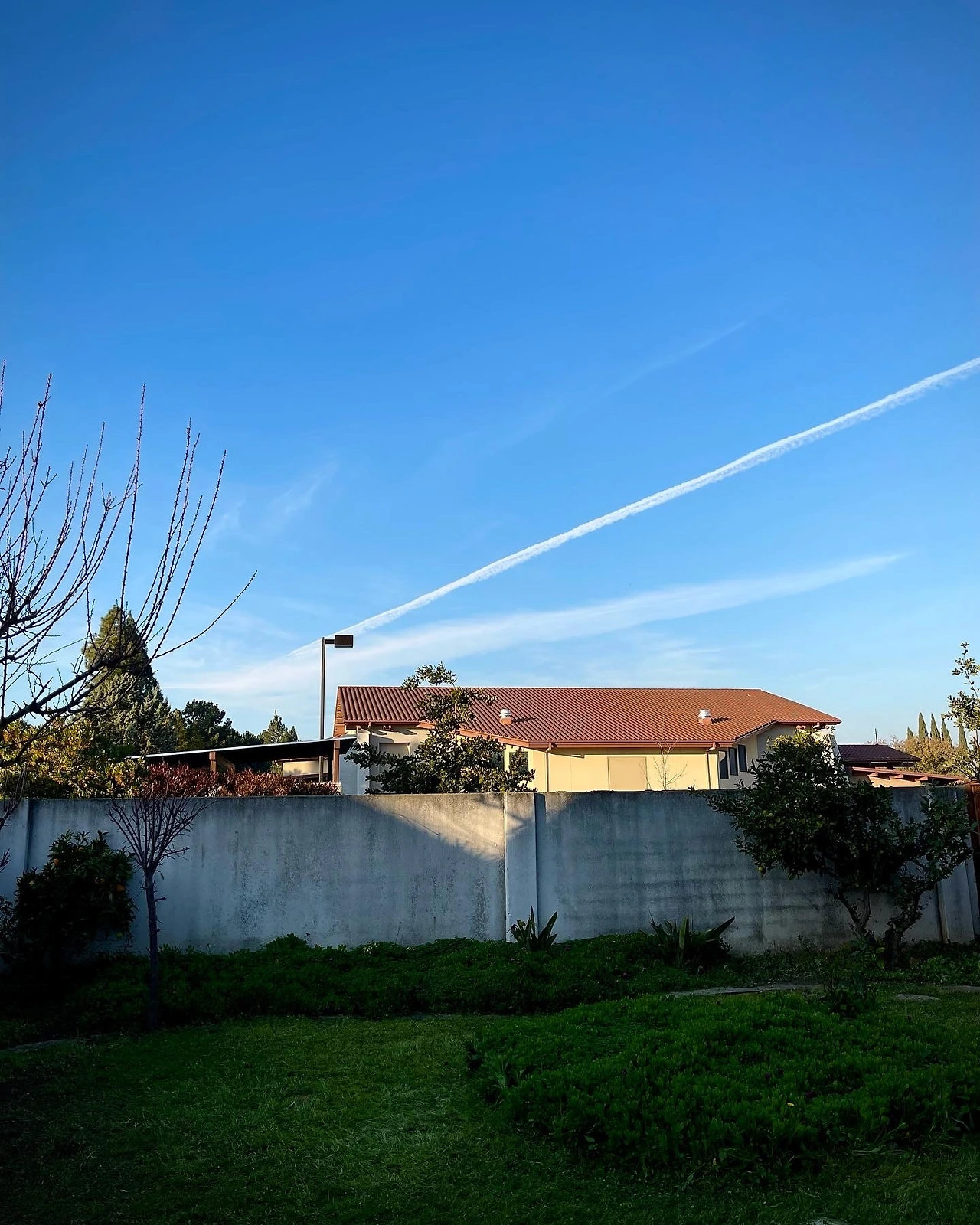 잠시 쉬는 사이 날아가는 비행기 엉덩이에서 얇게 나온 비행운이 높은 하늘에 퍼져가는 모습을 지켜봤습니다.