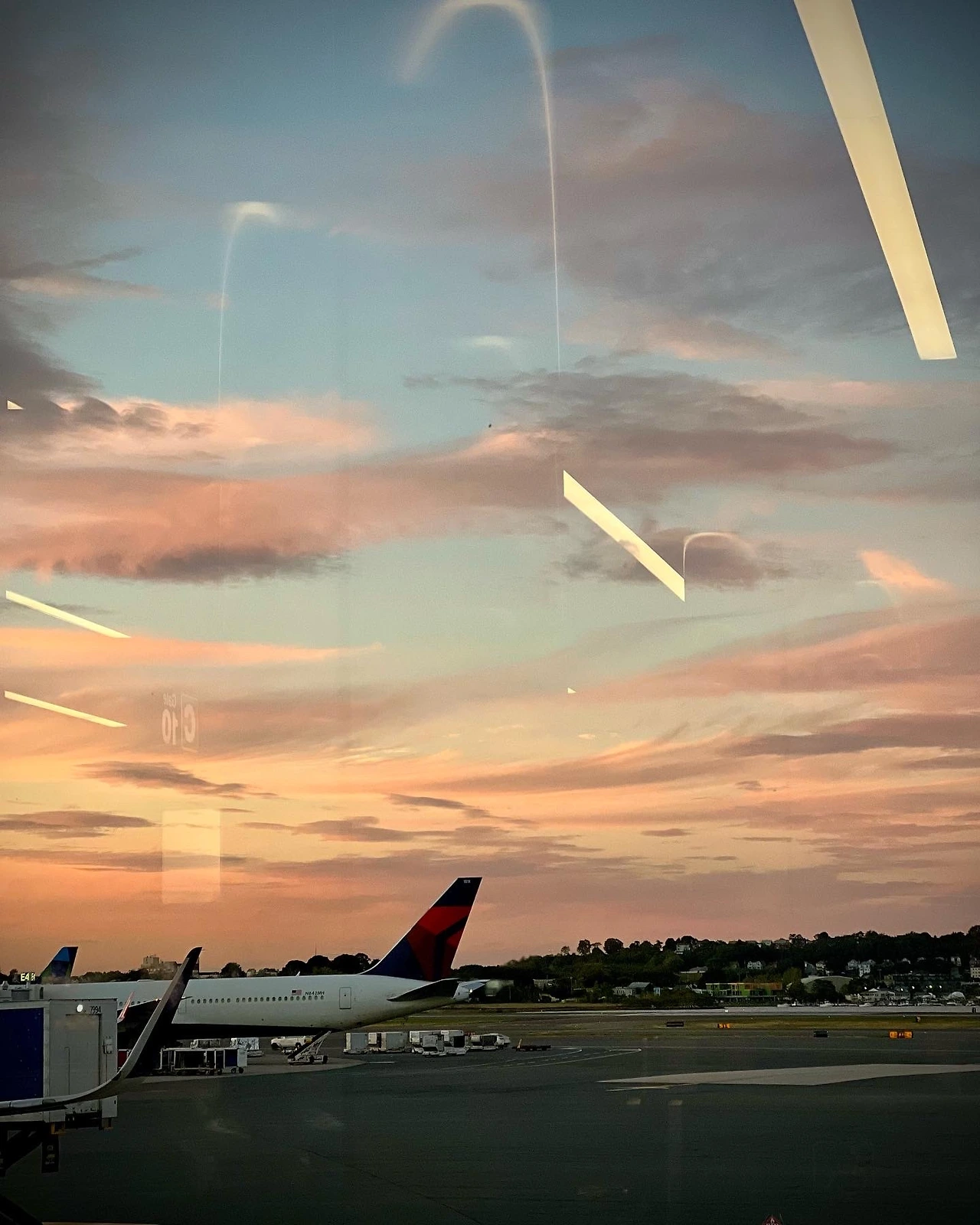 늦어지는 시간에 짜증이 나서 계류장을 내다보니 고장 난 비행기가 끌려가는 뒤로 예쁘게 석양이 지고 있었습니다.