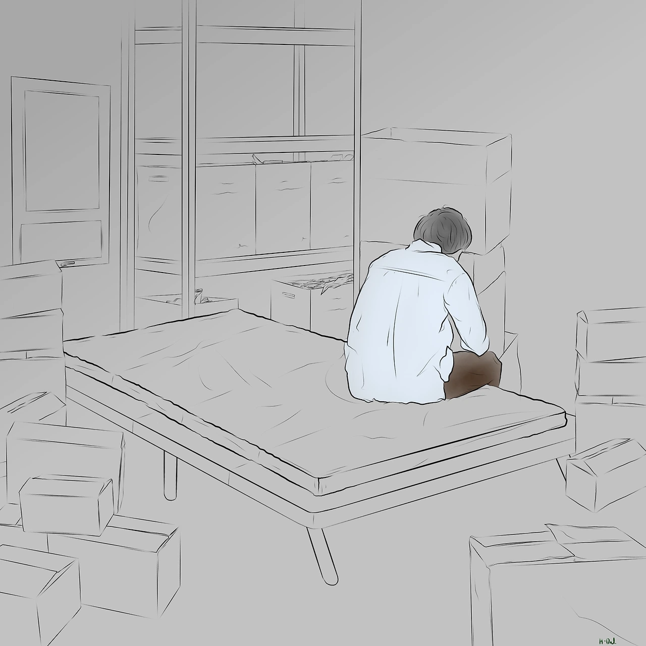 남자사람은 06시의 사무실에서 눈을 떴다. 유일하게 창을 열 수 있는 소회의실 뒤 창고. 온 세상이 담긴 가지각색의 박스로 둘러싸인 자그마한 방. 내성발톱 탓에 곪아 터진 오른쪽 엄지발가락으로 시선이 이동한다. 참을 수 없는 갈증이 밀려든다. 아침인지 저녁인지 세상이 어둡다. 확인이라도 하려는 듯 떠지지 않는 눈을 치켜뜨며 쳐진 몸을 반쯤 일으킨다. 사막에 뿌리 박힌 해바라기인 양 불충분한 태양광선을 갈구하며 상반신을 창으로 창으로 밀친다. 겨우 관자놀이가 창틀에 닿았다. 안 감은 머리로 손잡이를 밀어 올려 창을 열고 담배에 불을 붙인다. 갈증이 물러난다. 간이침대 오른쪽, 험한 발을 겨우 피한 모서리 끝에 반투명한 새끼 거미 한 마리가 위태롭게 매달려 있다. '이 가치 없는 발 때문에... .' 남자사람은 작은 거미가 꽤 귀엽다. 오늘도 연기 자욱한 폐가 목구멍을 친다. 하루의 시작이다.