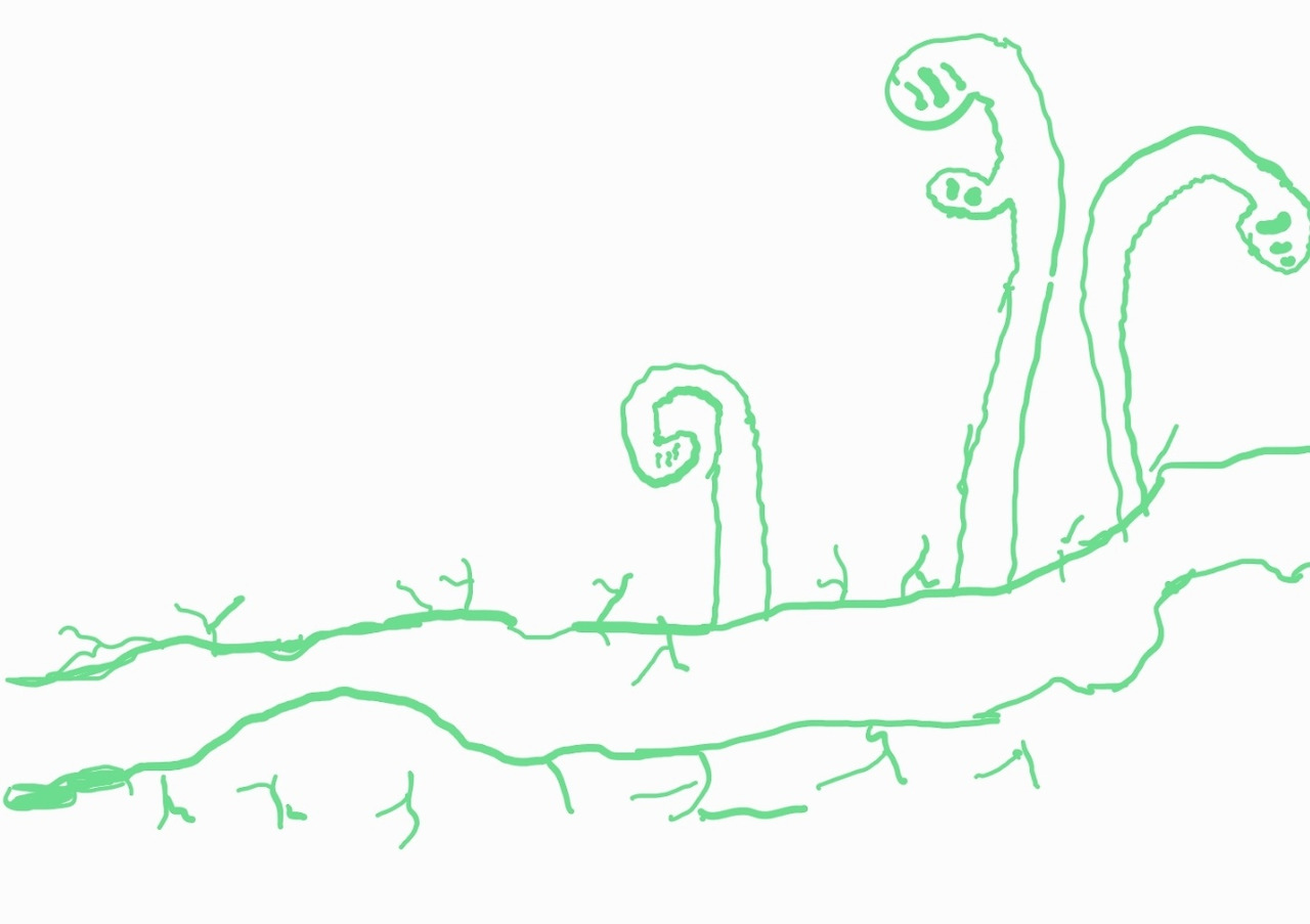 (주1) 근경(根莖)은 뿌리처럼 보이지만, 땅속 깊숙히 뻗어나가는 지하 줄기이다. 고사리는 근경을 가진 식물로 줄기 끝마다 생장점이 분열하면서 옆으로 굵게 자라나간다.