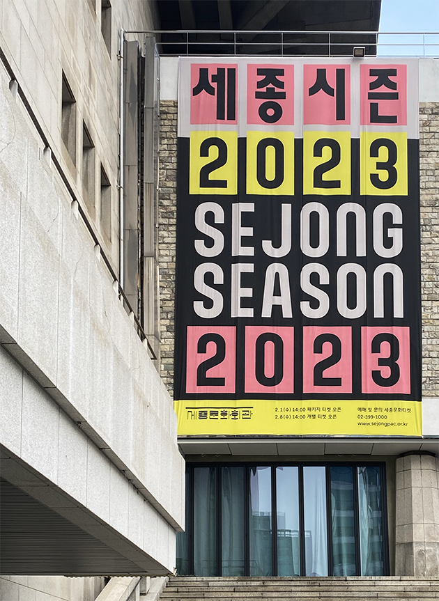 세종문화회관에서 올 한 해 자체 제작 공연 프로그램인 ‘세종시즌 2023’에 ⟨AG 마당 돋보임⟩을 사용했어요. 홈페이지와 광화문 일대의 배너, 공연 일정표에서 만나 보실 수 있어요.