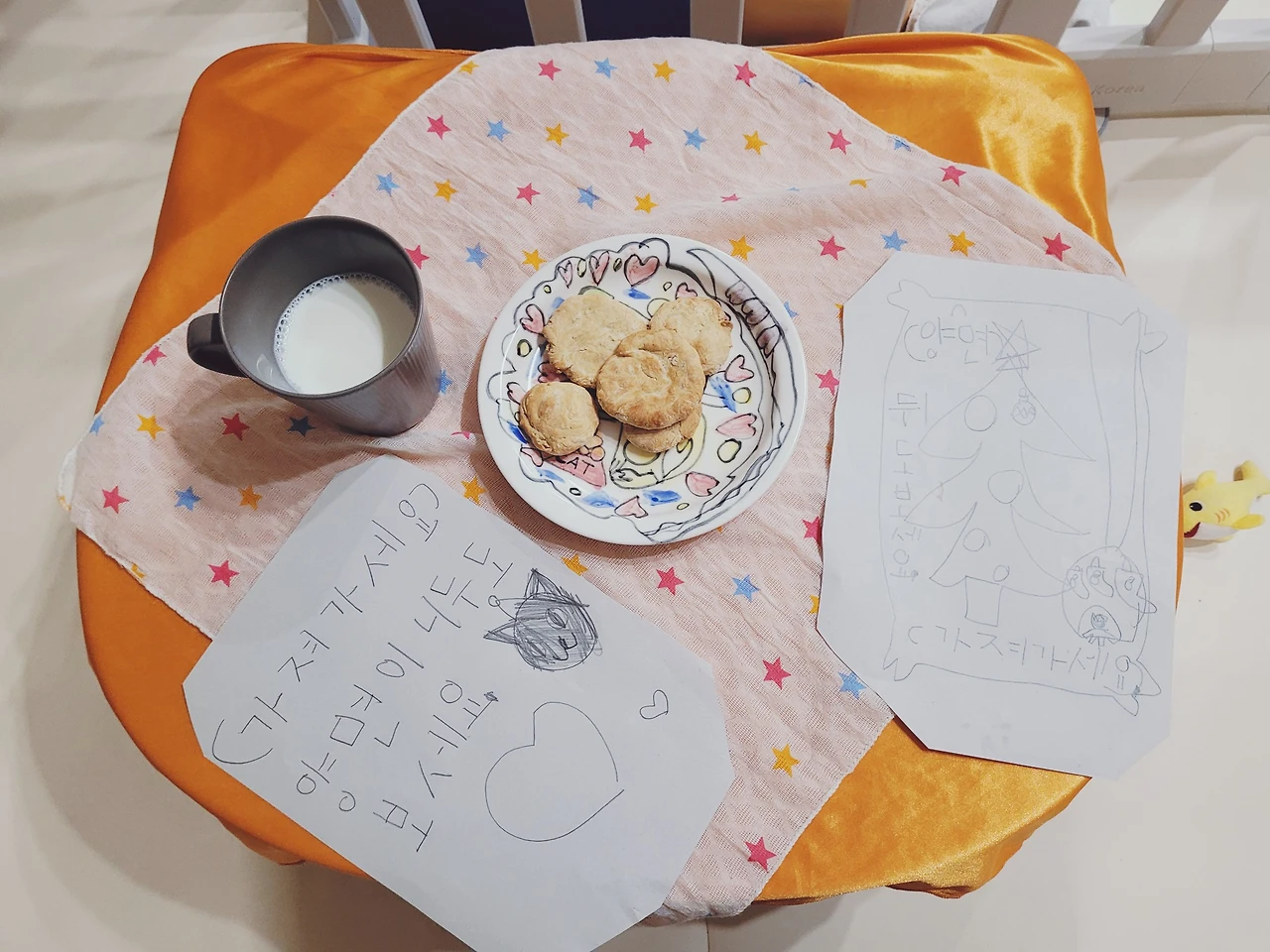 산타 사진 합성하는 어플도 있더라만 내 눈에는 조악하고, 유치원에서 산타를 만나 선물도 받았으니 이야기가 있는 판타지가 더 나으리라 생각했다. 우유와 쿠키 먹은 흔적에, 아이 편지에 짤막하게 답장이 있는 편이 더 근사하지 않은가. 나는 정자체를 열심히 써서 메모를 남겼다. 우리 산타 할아버지는 카드나 편지에 궁서체를 쓰시는 조선인이시다.