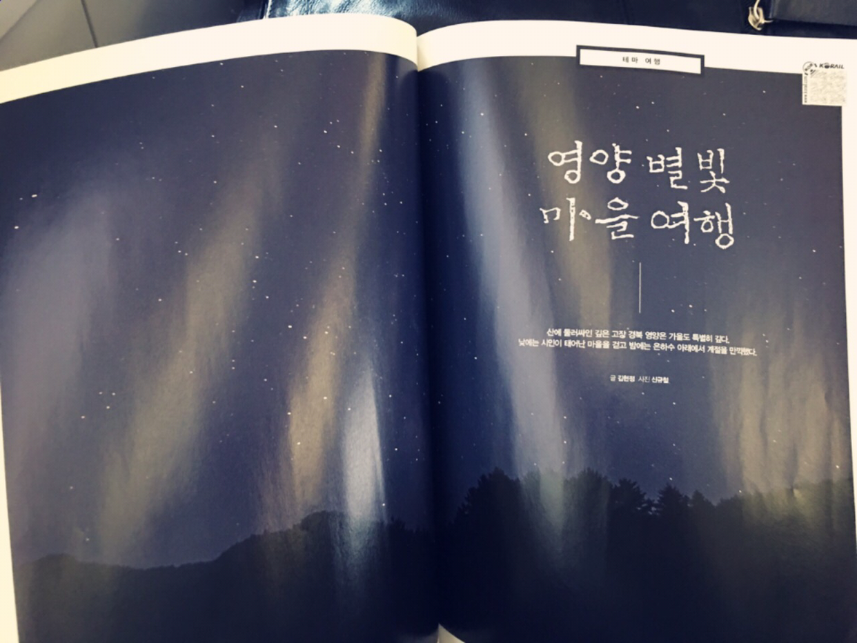 영양 별빛 마을 기행이란 표지에 혹해서 읽던 책을 던져두고 기내 잡지를 빼들었다. 내용은 둘째치고, 국제 별보호 지구라는 것에 마음을 빼앗겼다. 그래그래, 여기에 가면 후두둑 쏟아질 것 같은 별이 그득한 하늘이 있단 말이지, 거기에 덤으로, 아니 덤이라기엔 너무 크지만, 반디생태보호지구가 있어서 별이 땅으로 내려와 춤추는 것 같은 모습까지 볼 수 있단 말이지! 눈이 휘둥그래졌다. 아기가 조금 더 크면 꼭 가리라 마음을 먹고 사진을 찍어 저장한다.