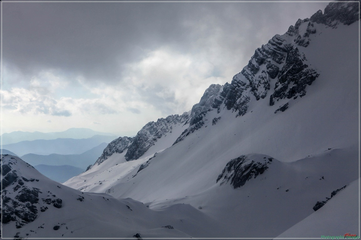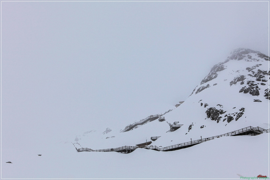 이번여행 마지막 여정이면서 클라이막스인 옥룡설산(5396m)의 정상 바로 아래 4506m 고지에 도착한다. 더 이상 올라가는 것은 자연이 허락 하지 않는다. 몇일동안 쫒아다니던 구름이 산정상을 덮어버린 탓이다.