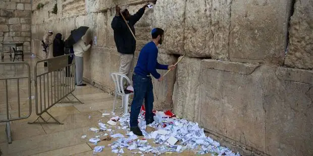 통곡의 벽 틈틈이 빼곡한 기도문을 정리하고 있는 장면