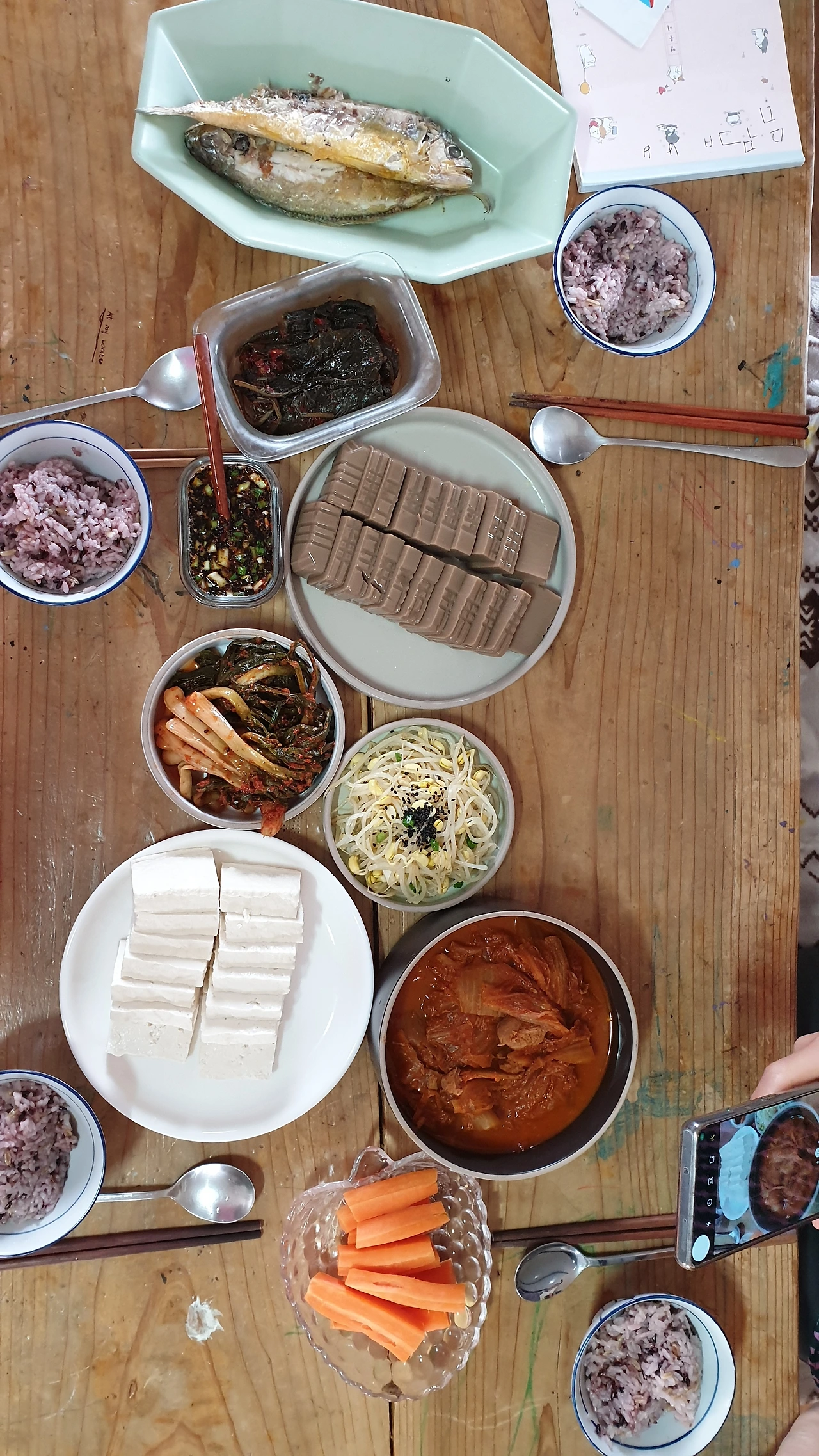 6. 윗층아이가 놀러와서 아이가 함께 노는데 배고프다고 해서 오리고기 요리하는데 그냥 윗층 식구들 다 불러서 된장찌개, 오리고기 요리해서 함께 식사 (어제는 우리가 얻어먹음)