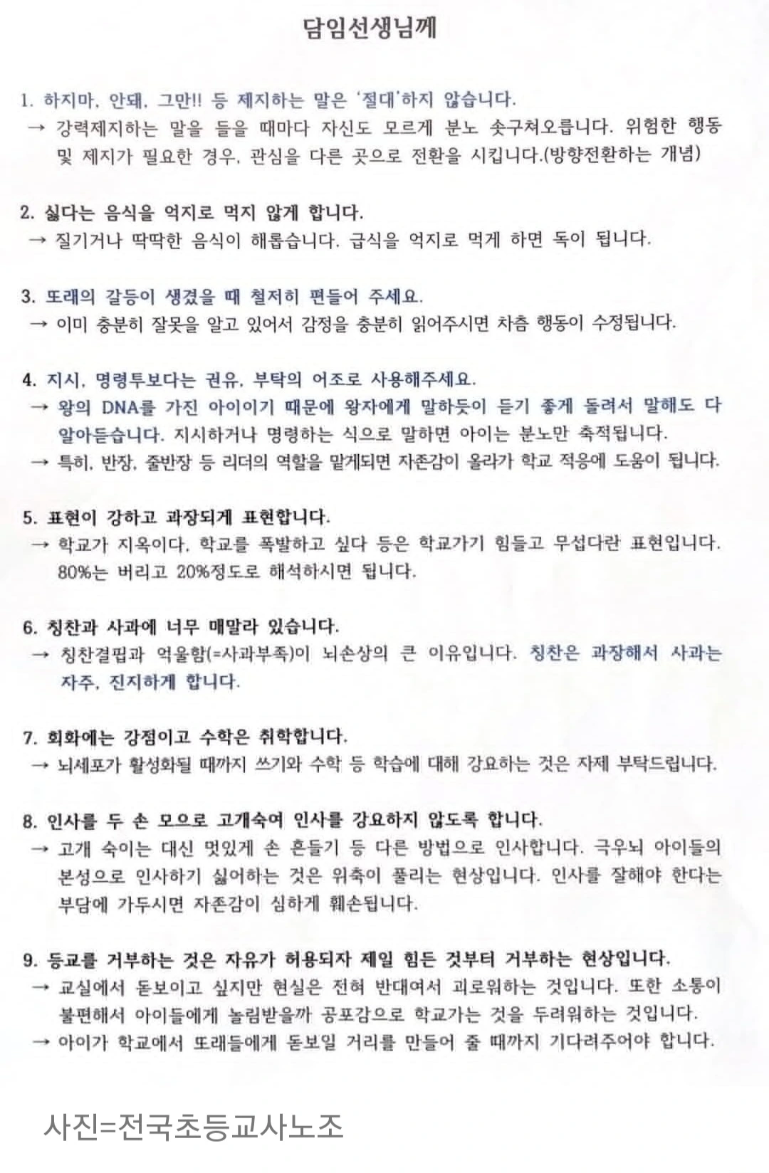 교체된 담임교사에게 ‘왕의 DNA가 있는 아이기 때문에 왕자에게 말하듯이 말하라’는 내용의 편지를 보냄.