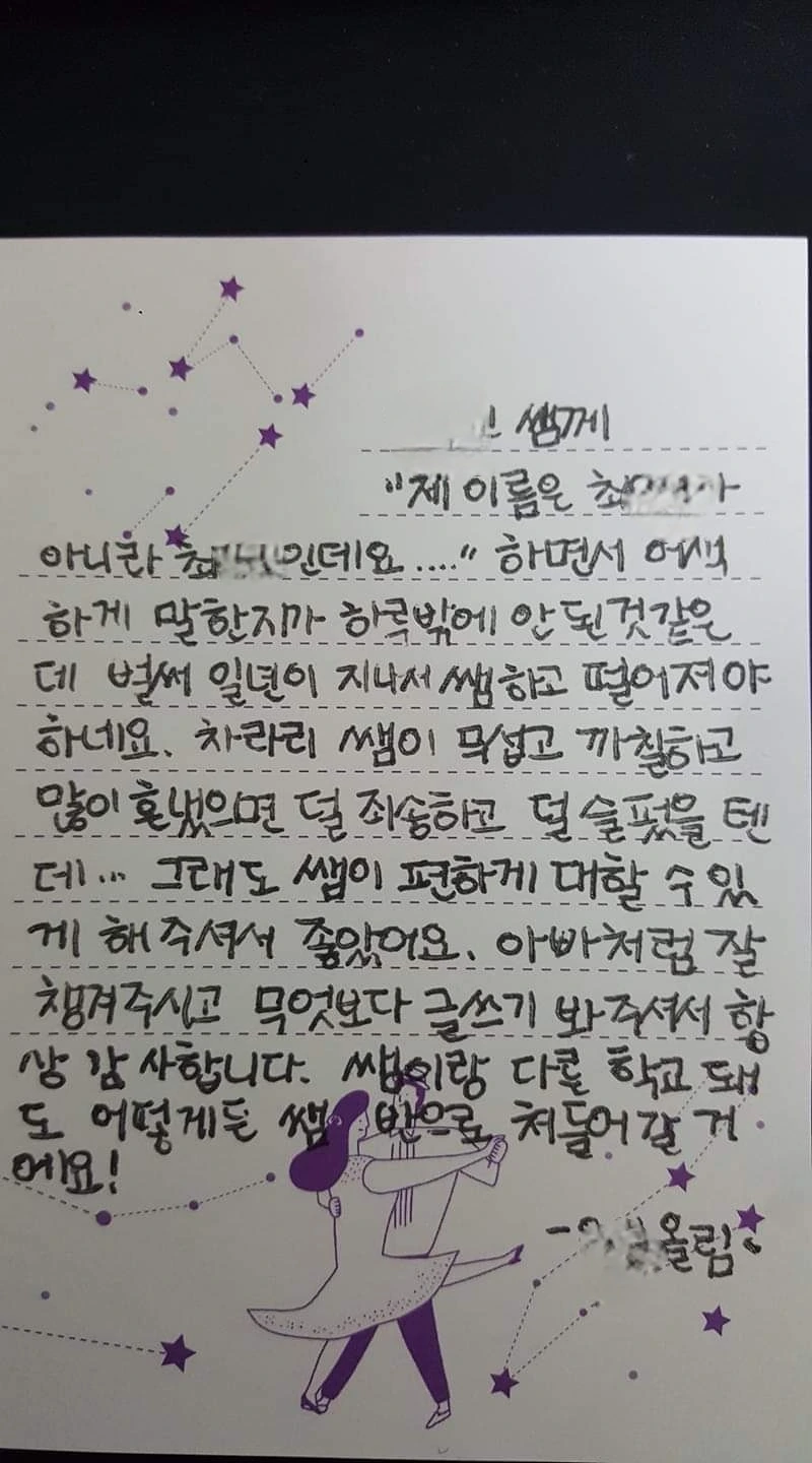 편지는 학기가 끝나는 마지막 날 받았다. 그리고 내 마음속에 너무 크게 자리 잡은 녀석을 남겨둘 수 없기에 연을 끊었다. 내가 이 아이를 가슴에 품고 있으면 이후에 만나는 아이들에게 너무 큰 기대와 실망을 할 것이 뻔했기 때문이었다.