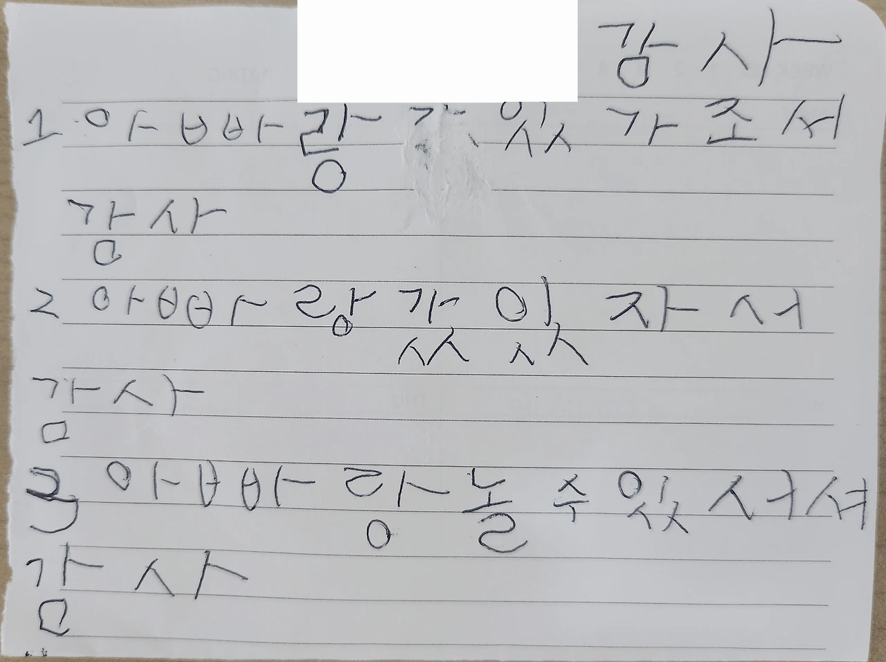 기쁨이가 드디어 감사제목을 스스로 쓰기 시작했어요