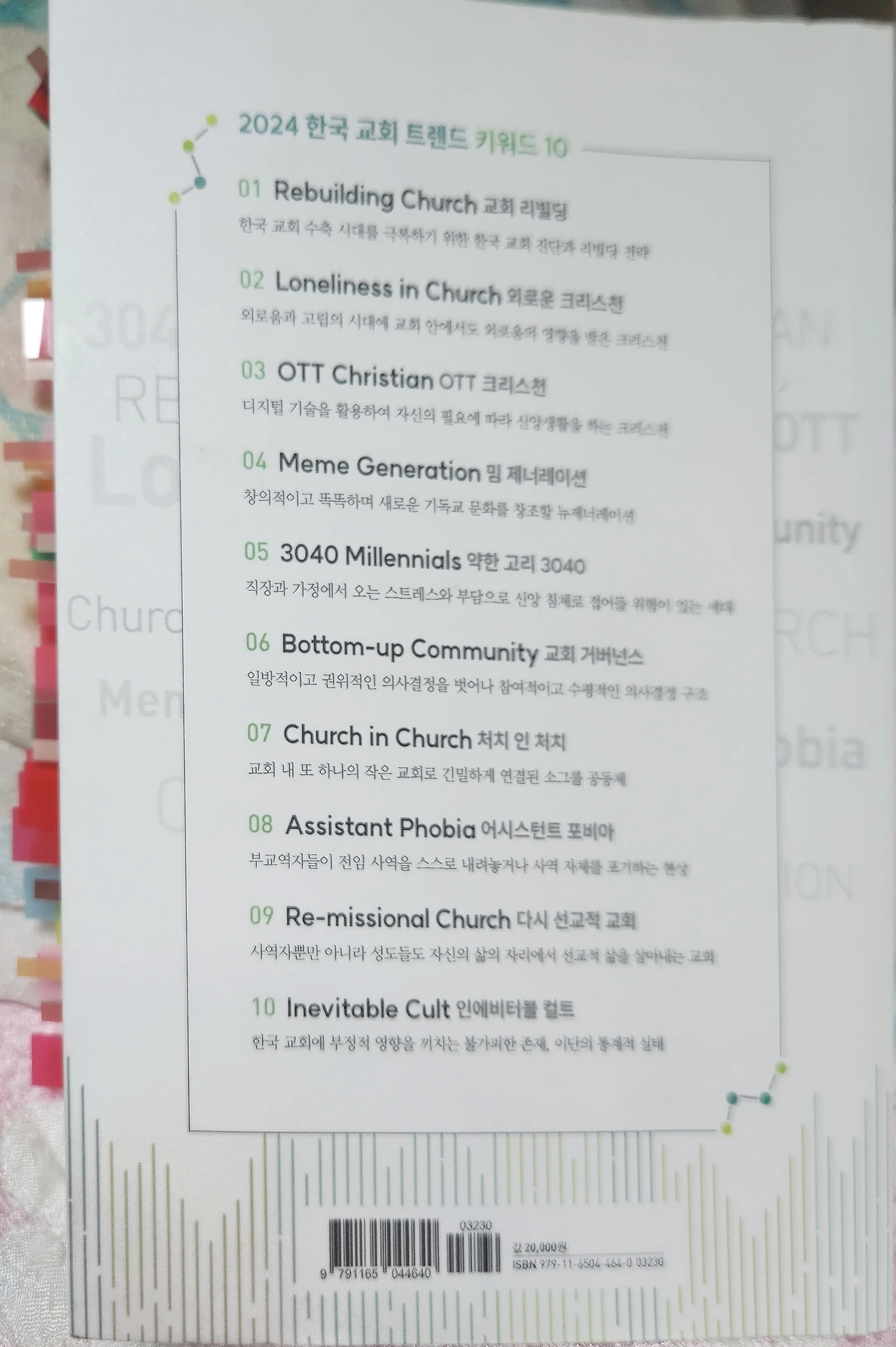 5. 지난번에 읽었던 2024 한국 교회 트렌드 책을 다 읽었습니다. 방대한 양의 정보를 통해 한국 교회에 대한 이해뿐만 아니라 제 자신의 현 위치와 방향성을 가늠할 수 있는 귀한 기회가 되었습니다
