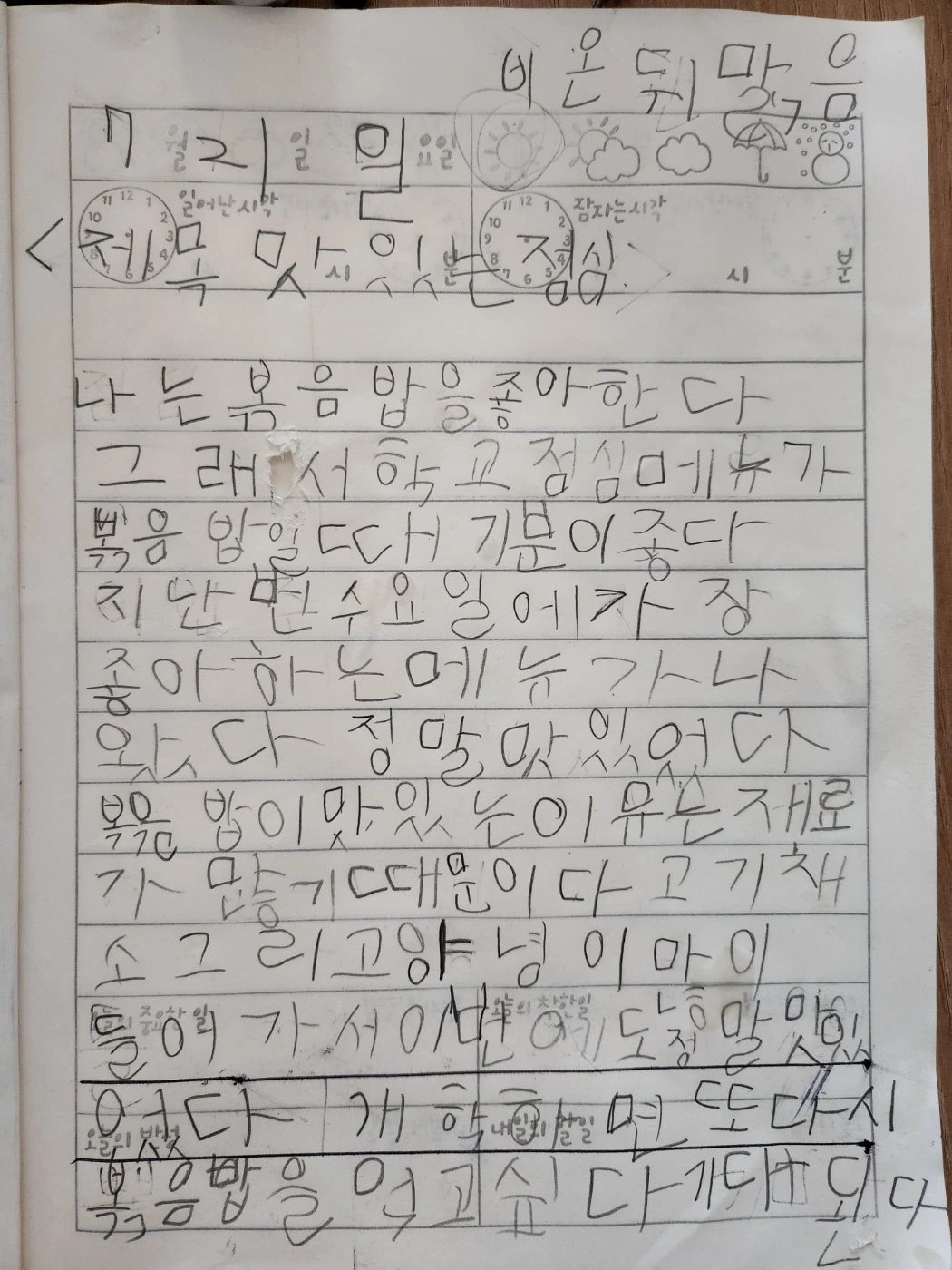 - 아빠 나는 지난번에 학교 급식에서 나온 맛있는 볶음밥 이야기를 쓰고 싶은데,