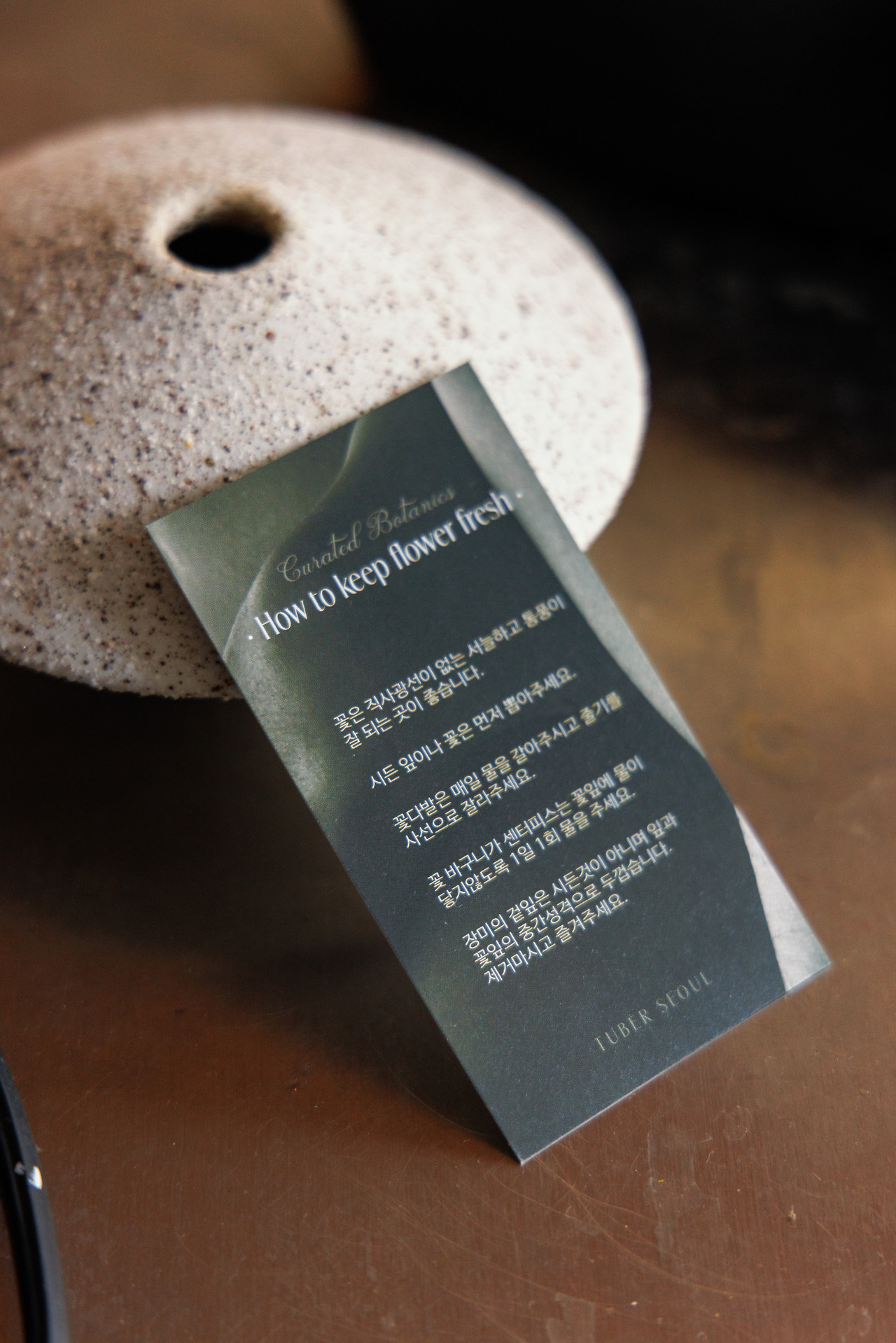 ‘꽃으로 최고를 전합니다’라는 슬로건 아래 튜베라는 이름의 공간을 운영 중이고요, 꽃을 받는 순간이 그날의 최고의 순간이 되길 바라는 마음으로 작업하고 있어요.