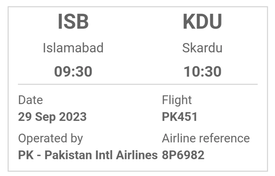 내가 여행한 9월 29일(2023년 무함마드 탄신일)을 기준으로 에어 블루(Air Blue)는 월, 수만 운항, 악명 높은 피아(PIA, Pakistan International Airlines)는 금, 일 내가 원하는 일정에 운항을 하였다. 내가 여행했던 때 기준으로는 피아는 우리