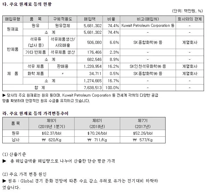 아래는 SK이노베이션 사업보고서 중 SK에너지의 주요 원재료 설명 부분이다. '사업의 내용' 파트 뒷부분에 등장하는 내용이다. 원재료의 가격, 원재료 가격의 변동 원인, 원재료 매입액 등을 정리해놓았다.