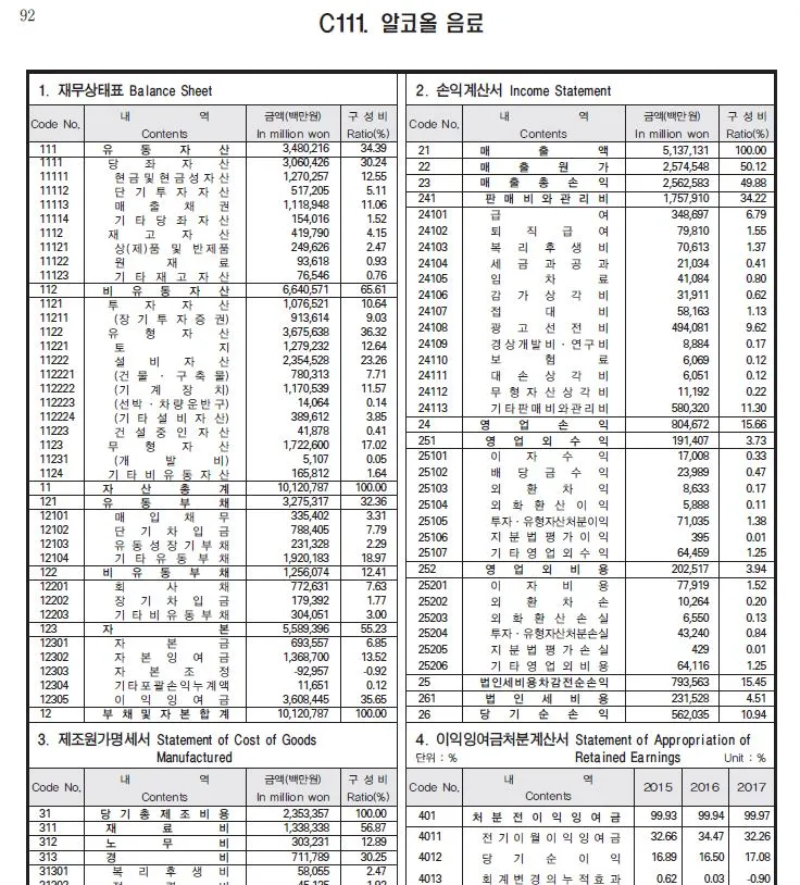 보고서는 업종별로 위와 같은 표를 통해 산업의 평균적인 재무상태표, 손익계산서, 제조원가명세서 등을 보여준다. 여기서 '구성비' 부분을 선택한 회사와 비교하면 된다.
