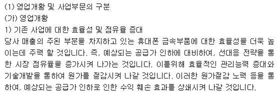 다음은 에스코넥이라는 코스닥 휴대폰 금속 부품 업체의 사업보고서 내용 중 일부이다.