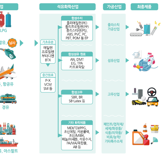 석유 화학 분야는 납사를 원료로 하여, 아래와 같은 제조흐름으로 기초유분인 에틸렌, 프로펠렌, 부타디엔, BTX를 생산하고, P-X(파라자일렌), VCM, SM 등의 중간원료를 생산한다.