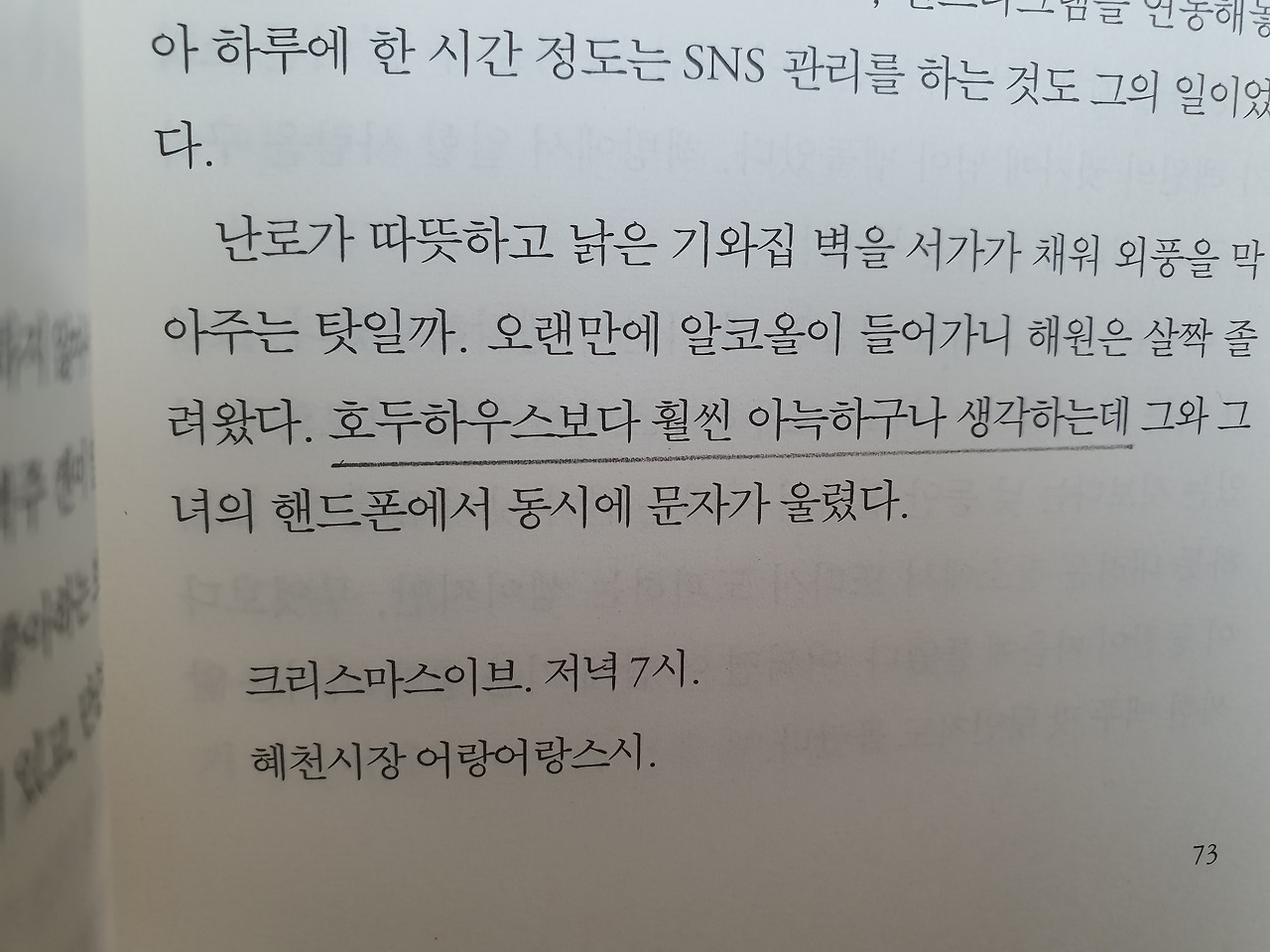 해원은 굿나잇책방에서 졸음을 느낀다. 굿나잇책방이 호두하우스보다 훨씬 아늑하다고 생각한다.