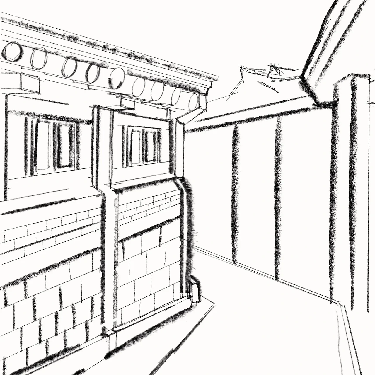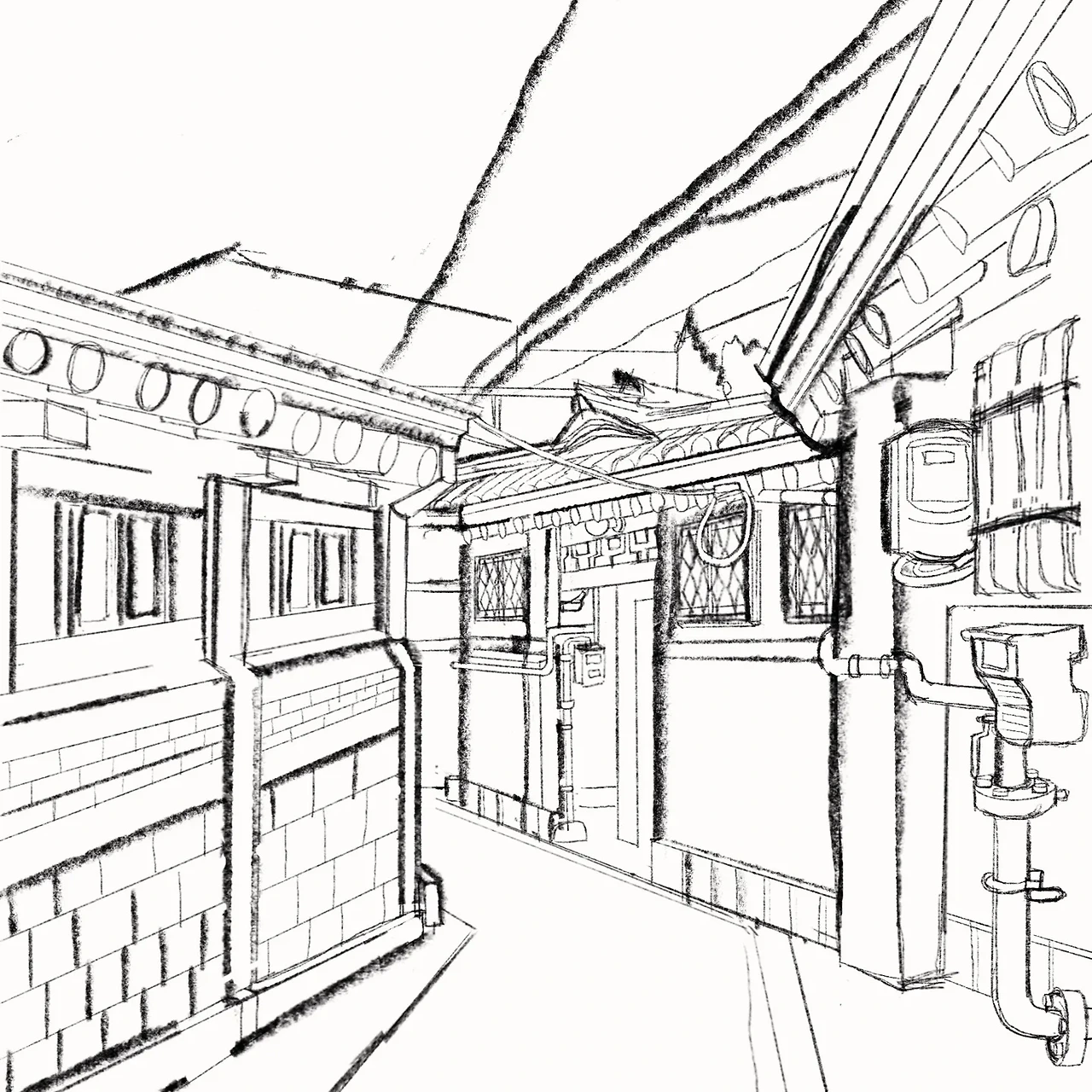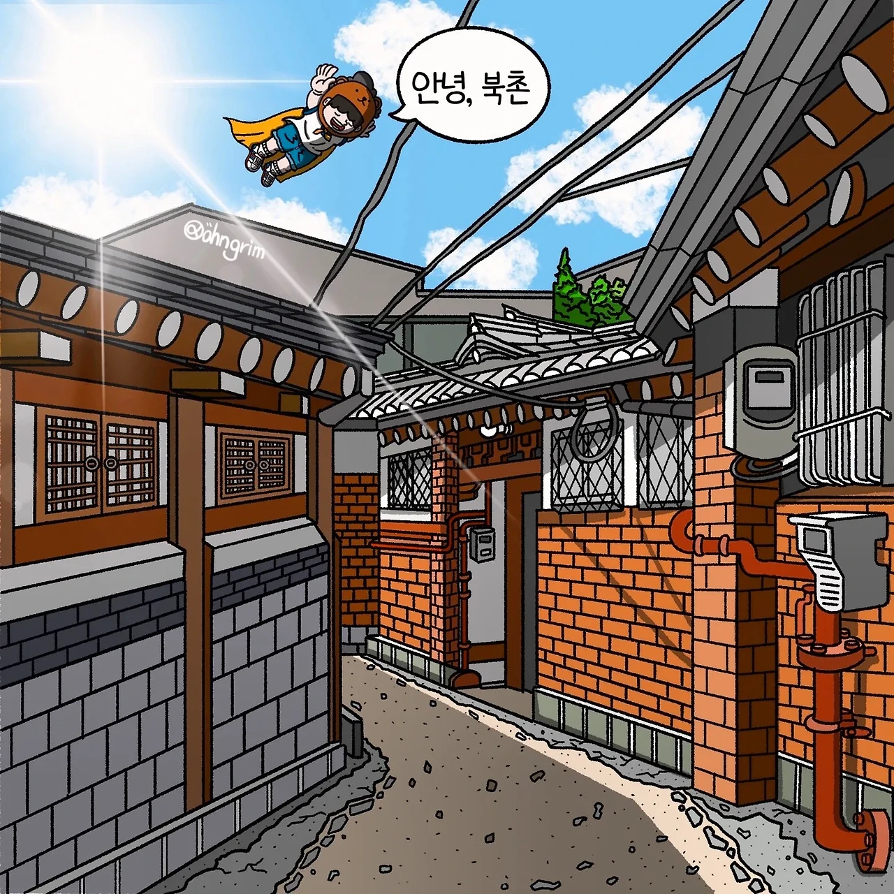 북촌 한옥 마을 골목길 느낌을 내고 싶었어요, 근데 좀 심심하더라고요. 그래서 하늘에 곱슬곰이 인사하는 모습을 더 그려봤어요ㅎ