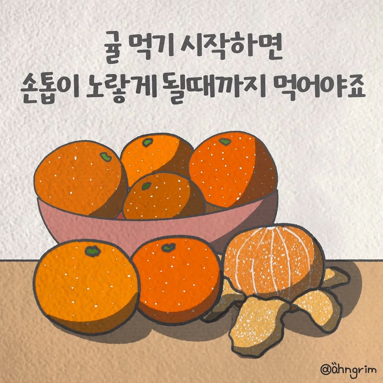 마트에서 귤 한 박스 사서 넷플릭스 틀어놓고 한 개씩 까먹다 보면 어느새 귤껍질이 수북하게 쌓이네요. 손톱 밑이 노래지는 게 내 손가락이 귤을 까느라 열일했나 보네요.