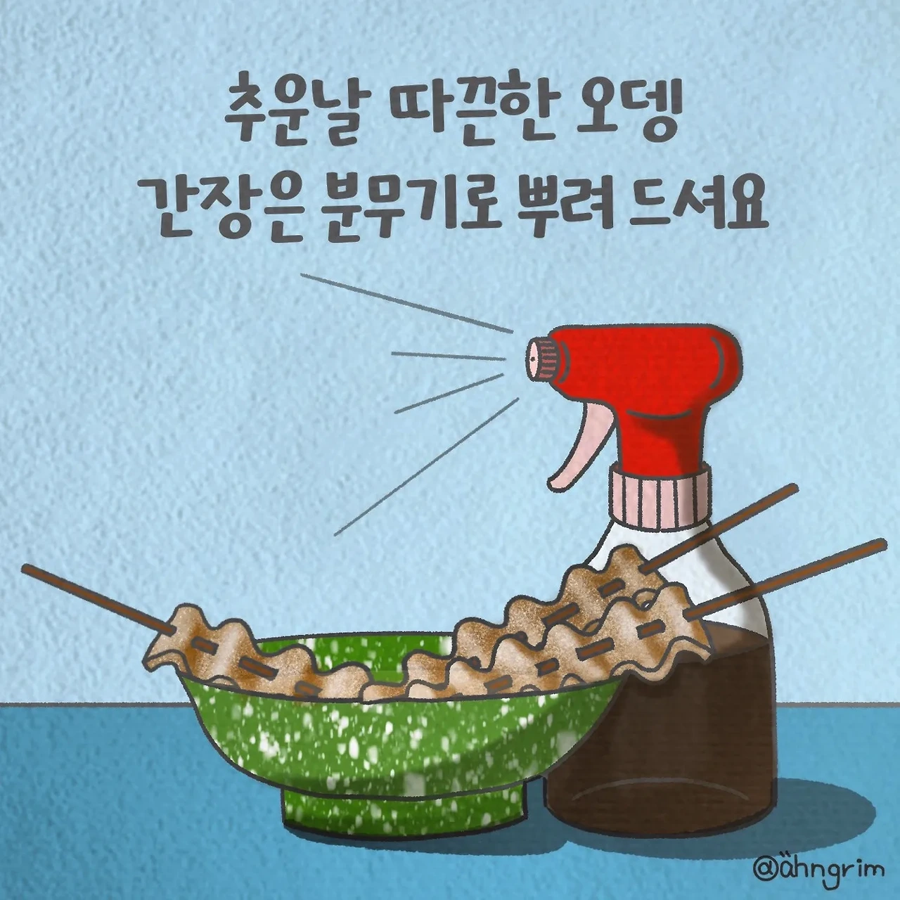 전철역에서 집에 가는 길에도 김이 풀풀 나는 곳에 사람들이 서서 오뎅을 먹고 있어요. 요즘 간장은 붓으로 칠하기도 하고 분무기로 뿌려 먹기도 해요. 여기저기 외치네요. "아주머니, 국물 좀 주세요" 한입 하면 추위가 싸악 사라져요.